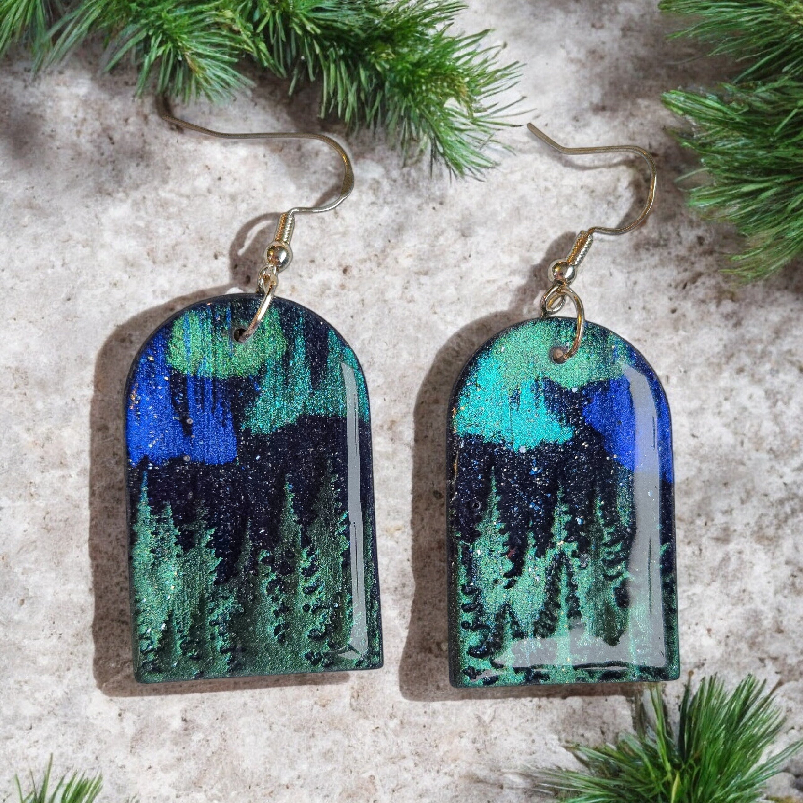 Beautiful aurora borealis earrings with green trees and star speckled sky