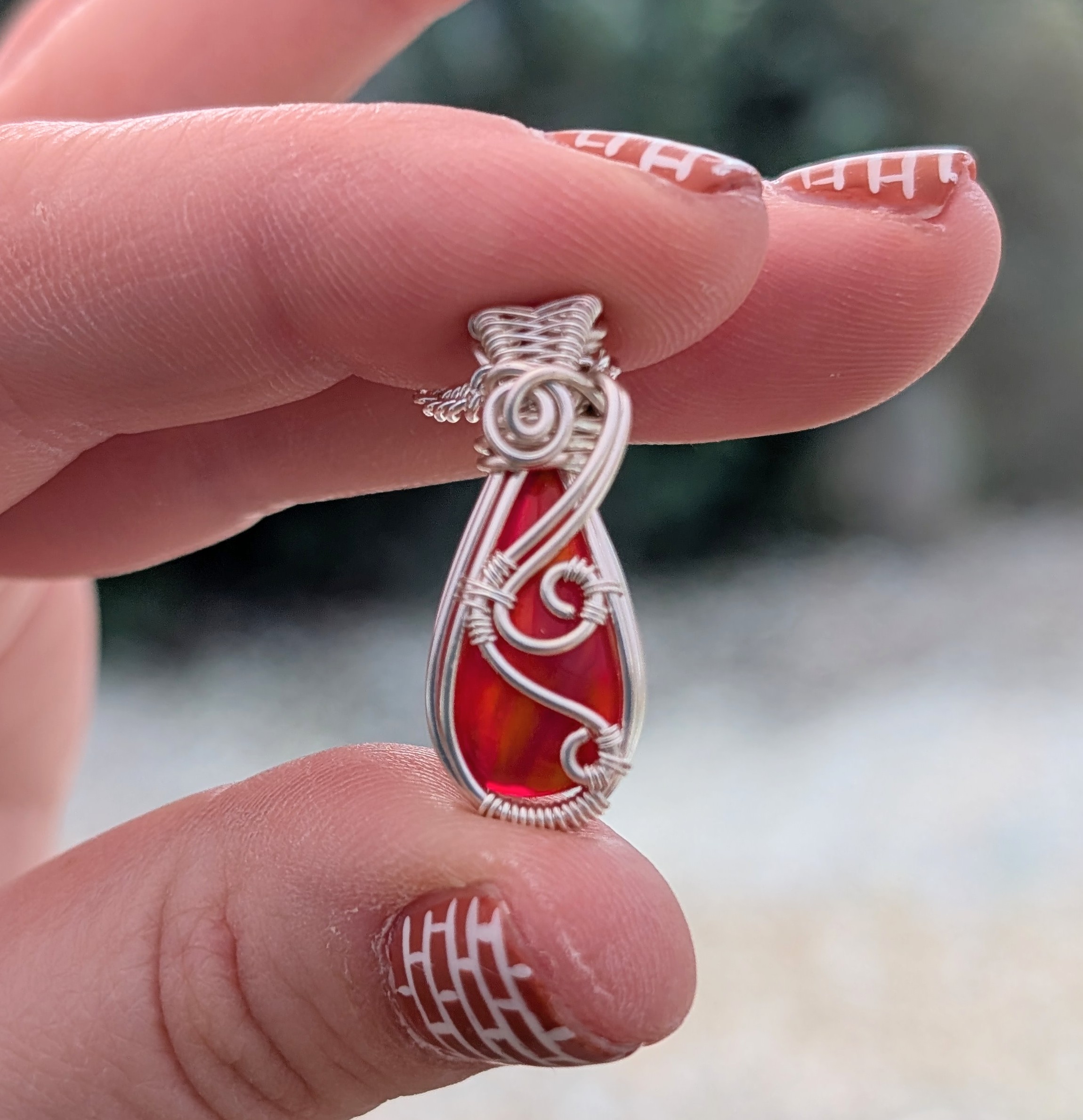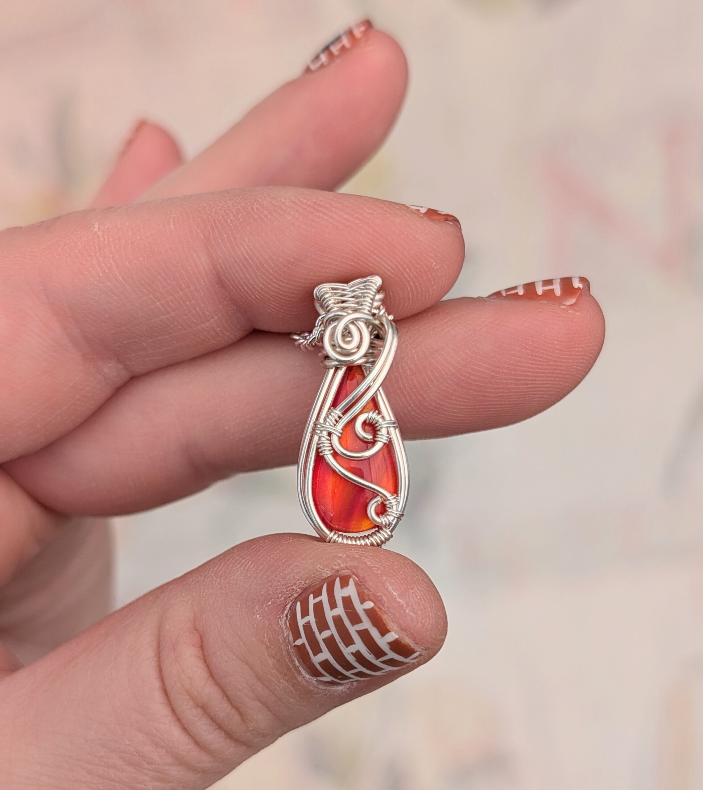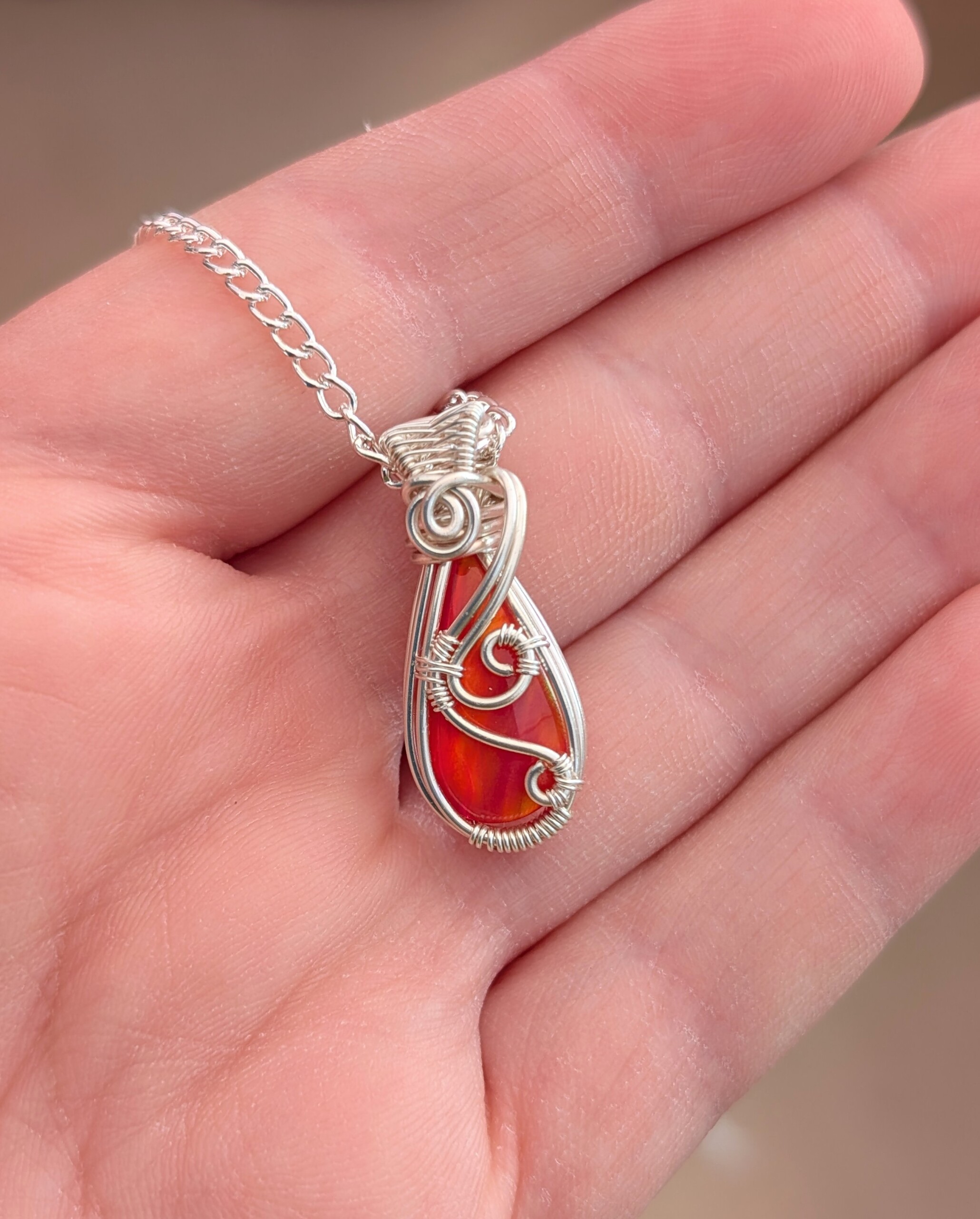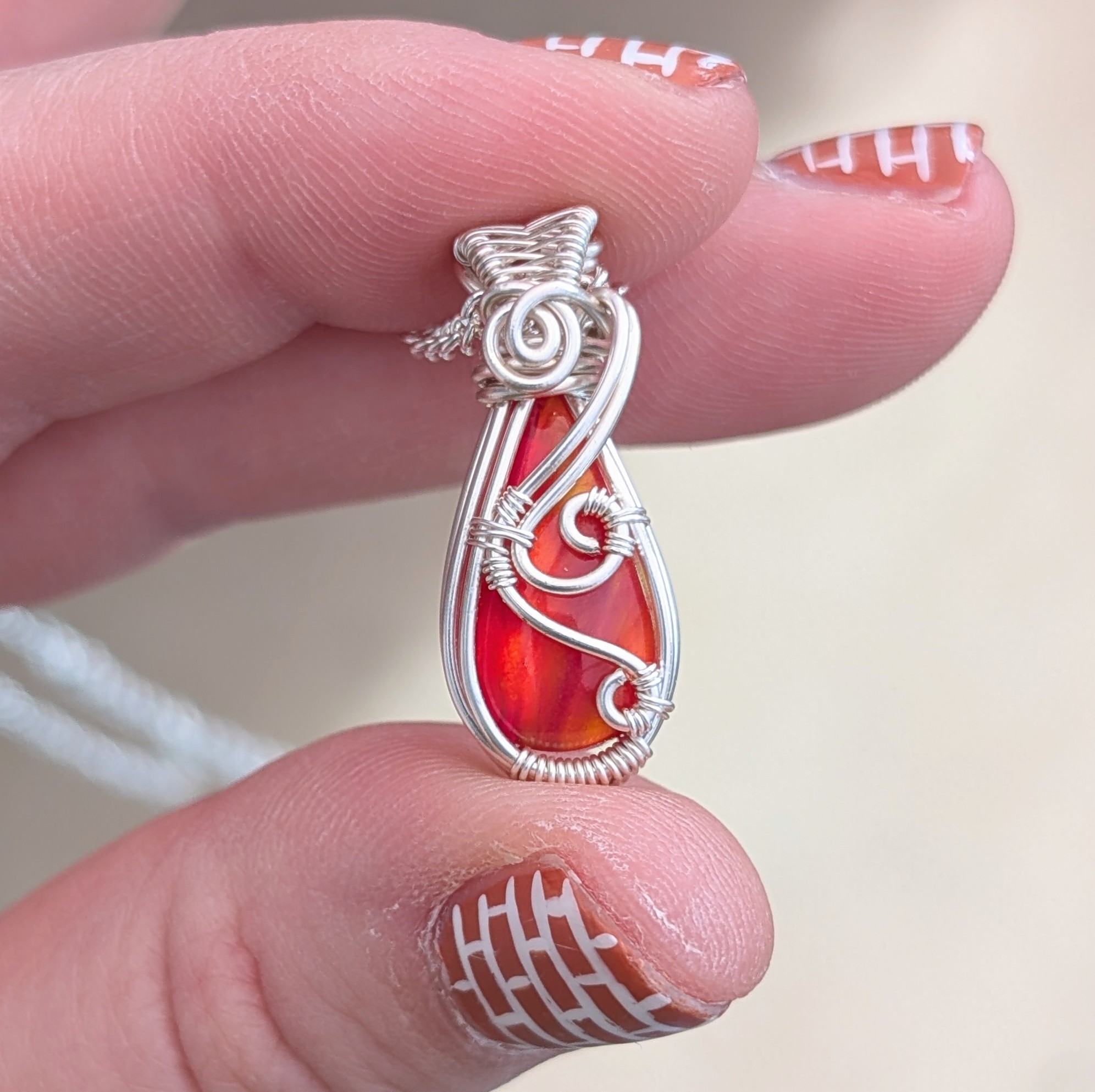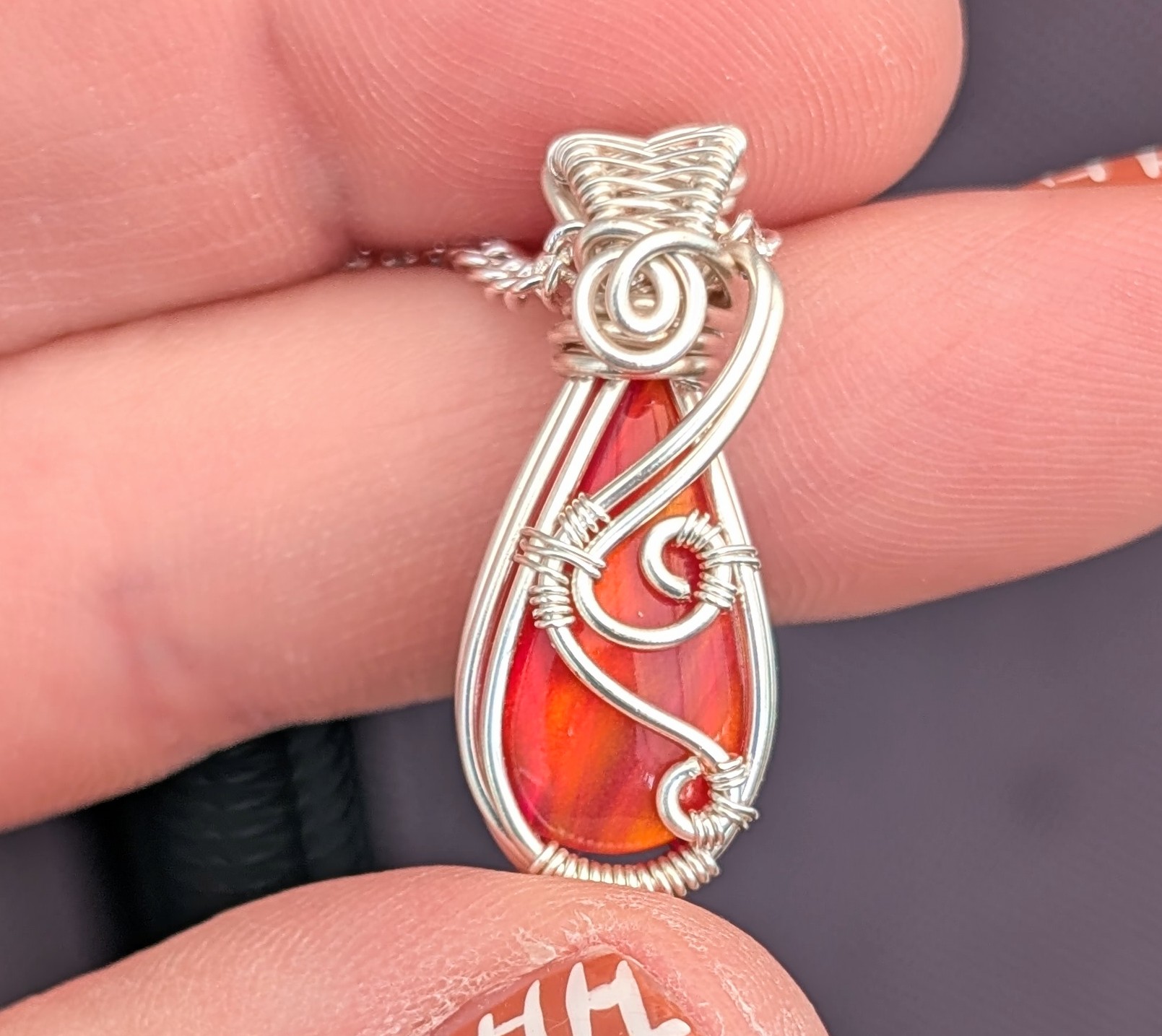 This pendant is made with a beautiful synthetic opal, which is an orange-red colour with vibrant gold/green flashes. This one is a lovely drop shape and the colours remind me of juicy fruit.