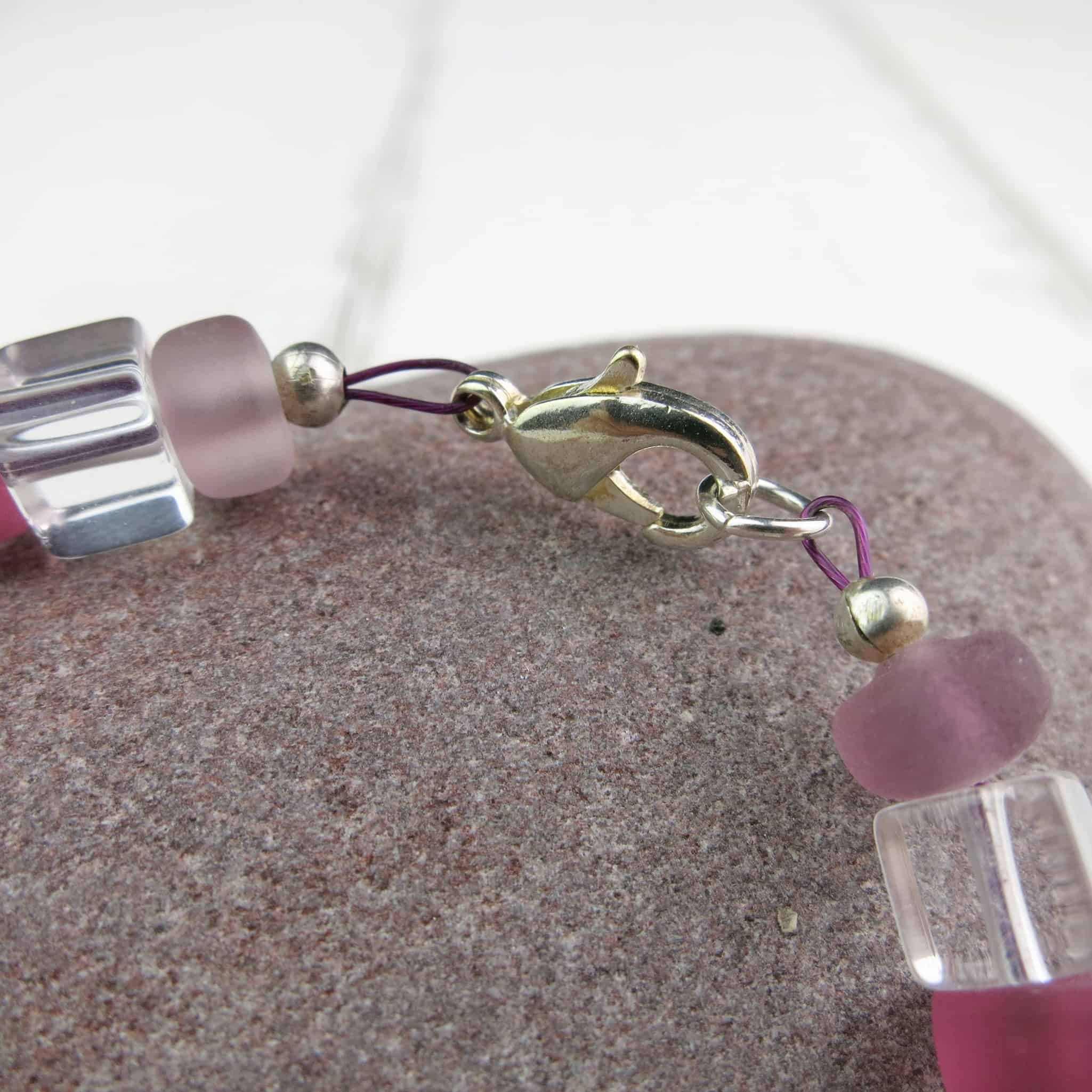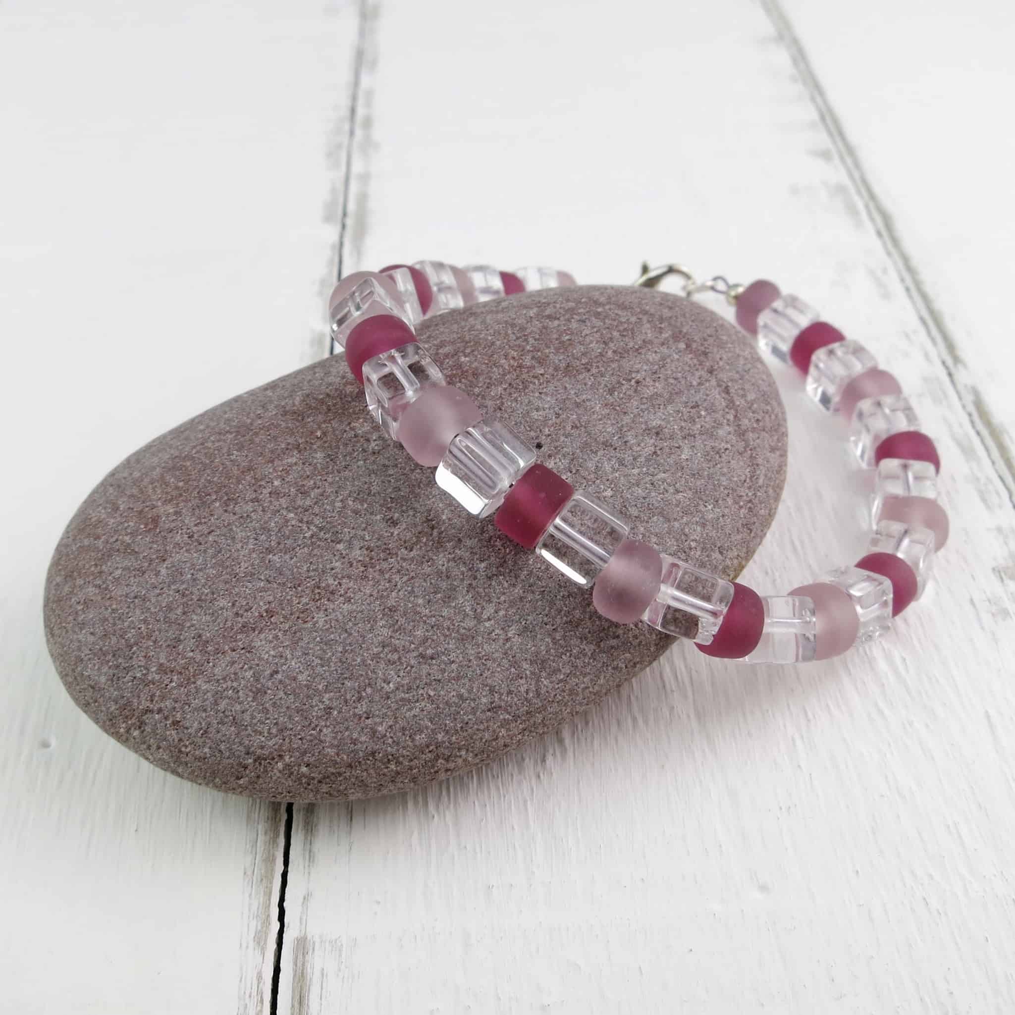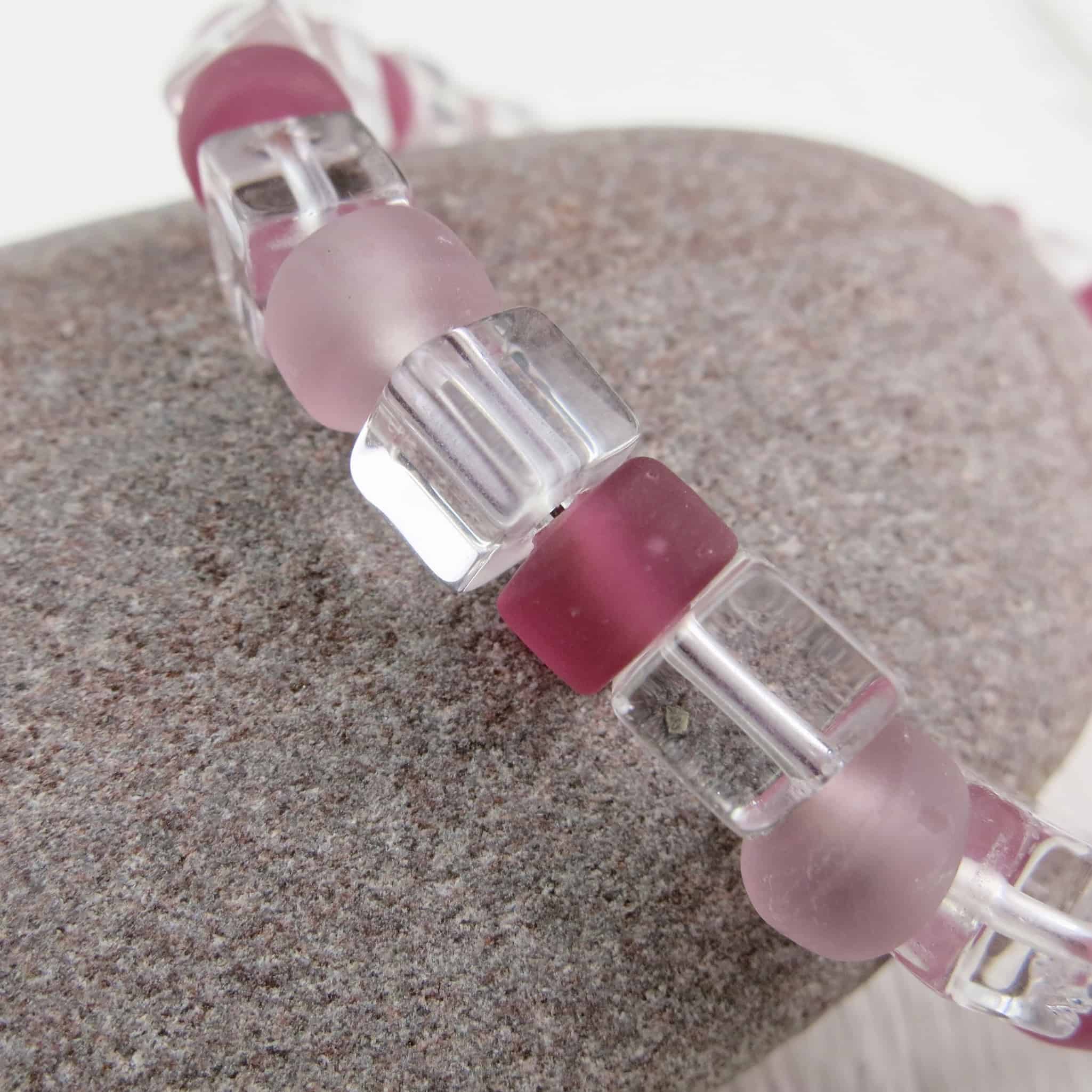 Pretty bracelet made using a mix of round pink and lilac frosted glass and square clear glass beads.