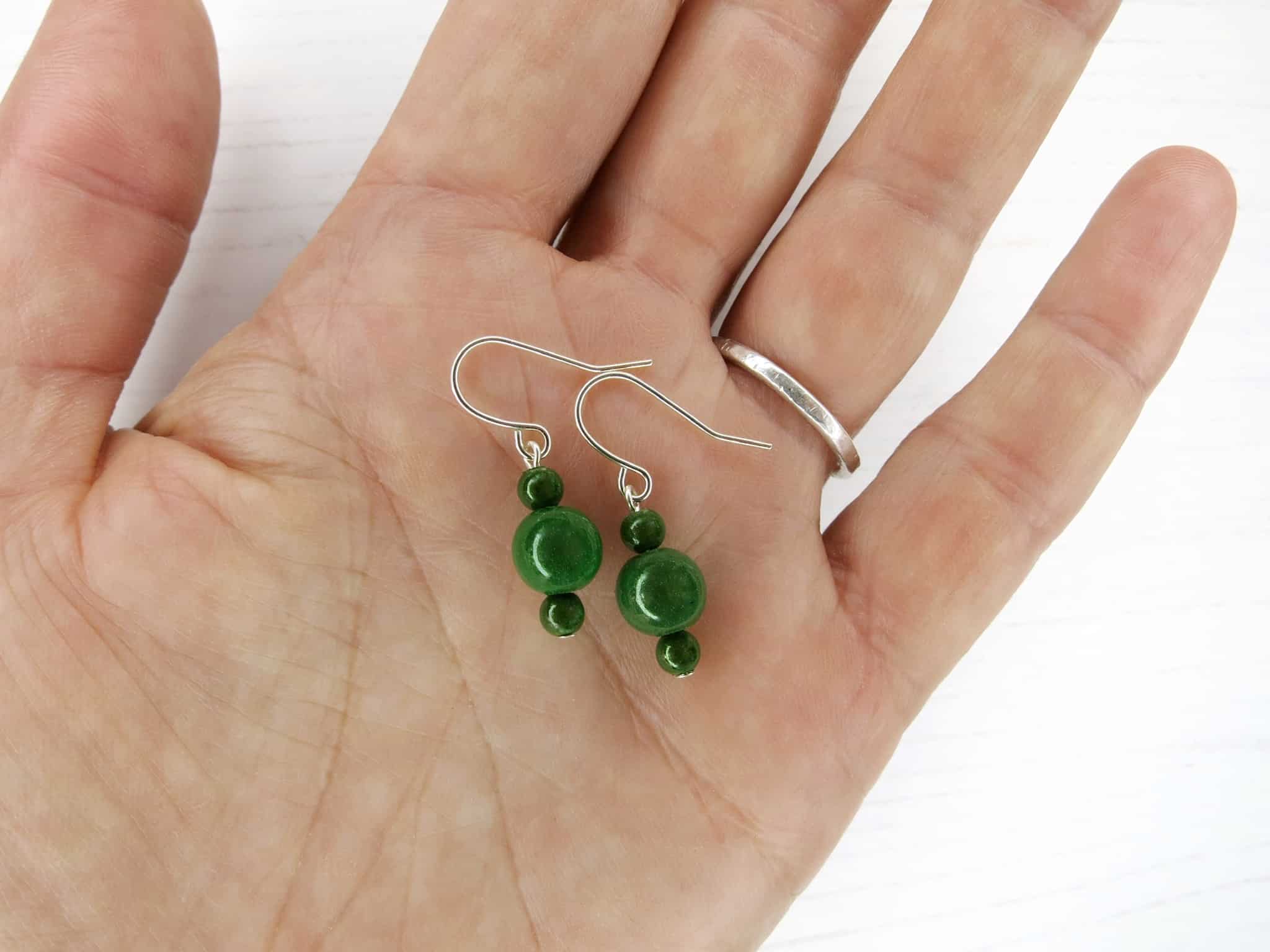 Beaded drop earrings with 8mm and 4mm miracle beads being held in my hand to show size.