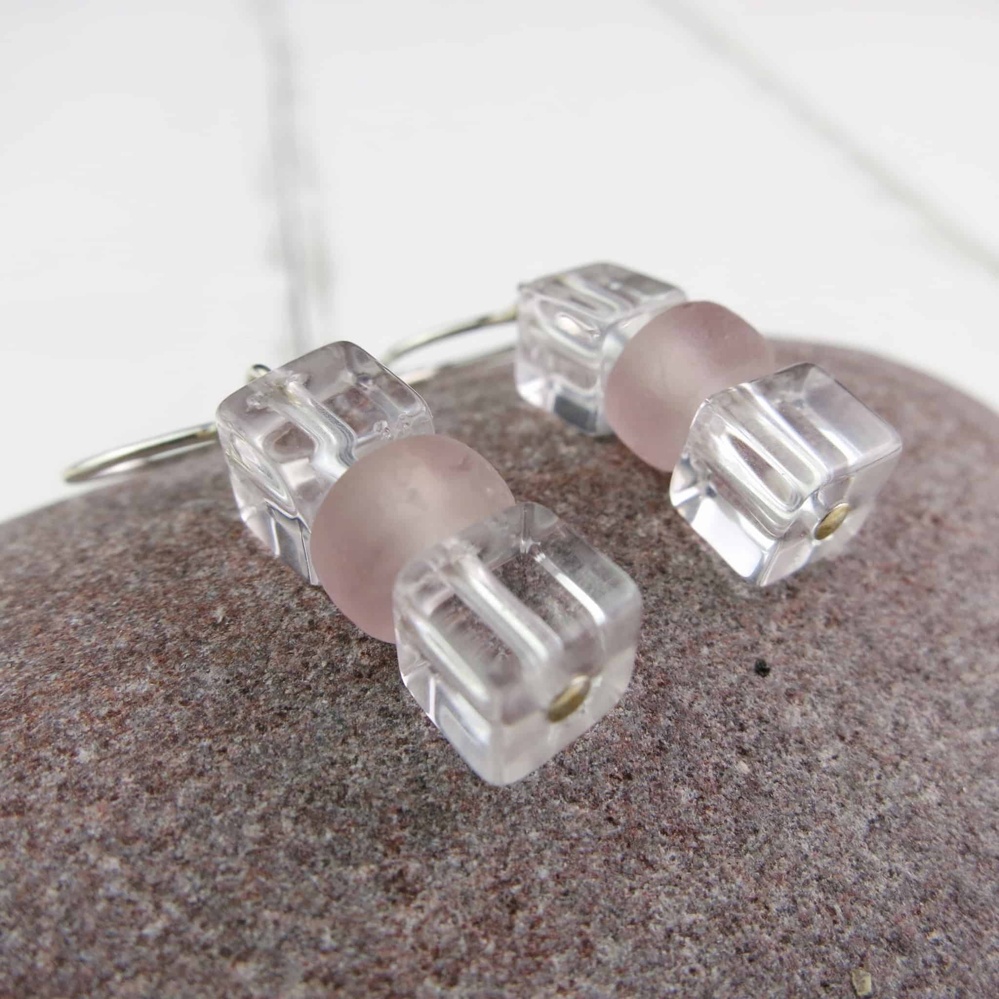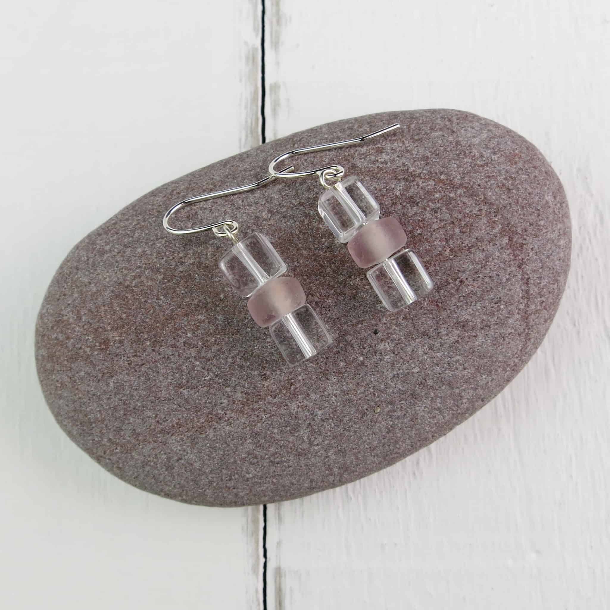 Drop earrings with two clear glass cube shaped beads either side of a frosted lilac bead on silver plated ear wires.