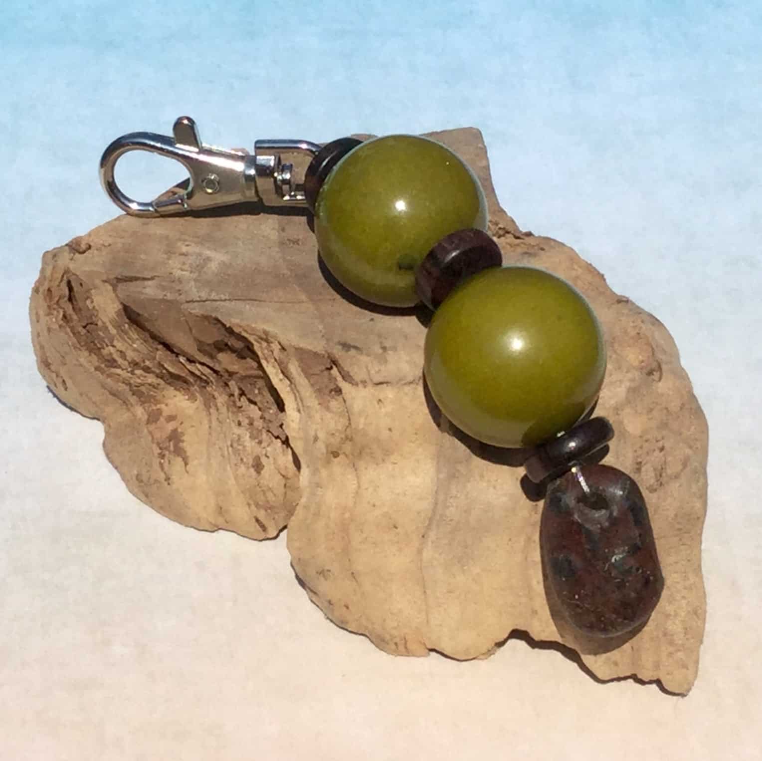 Keyring or bag charm made using chunky round olive green gemstones and Cornish Serpentine with dark wooden beads as spacers, finished with a trigger clip.