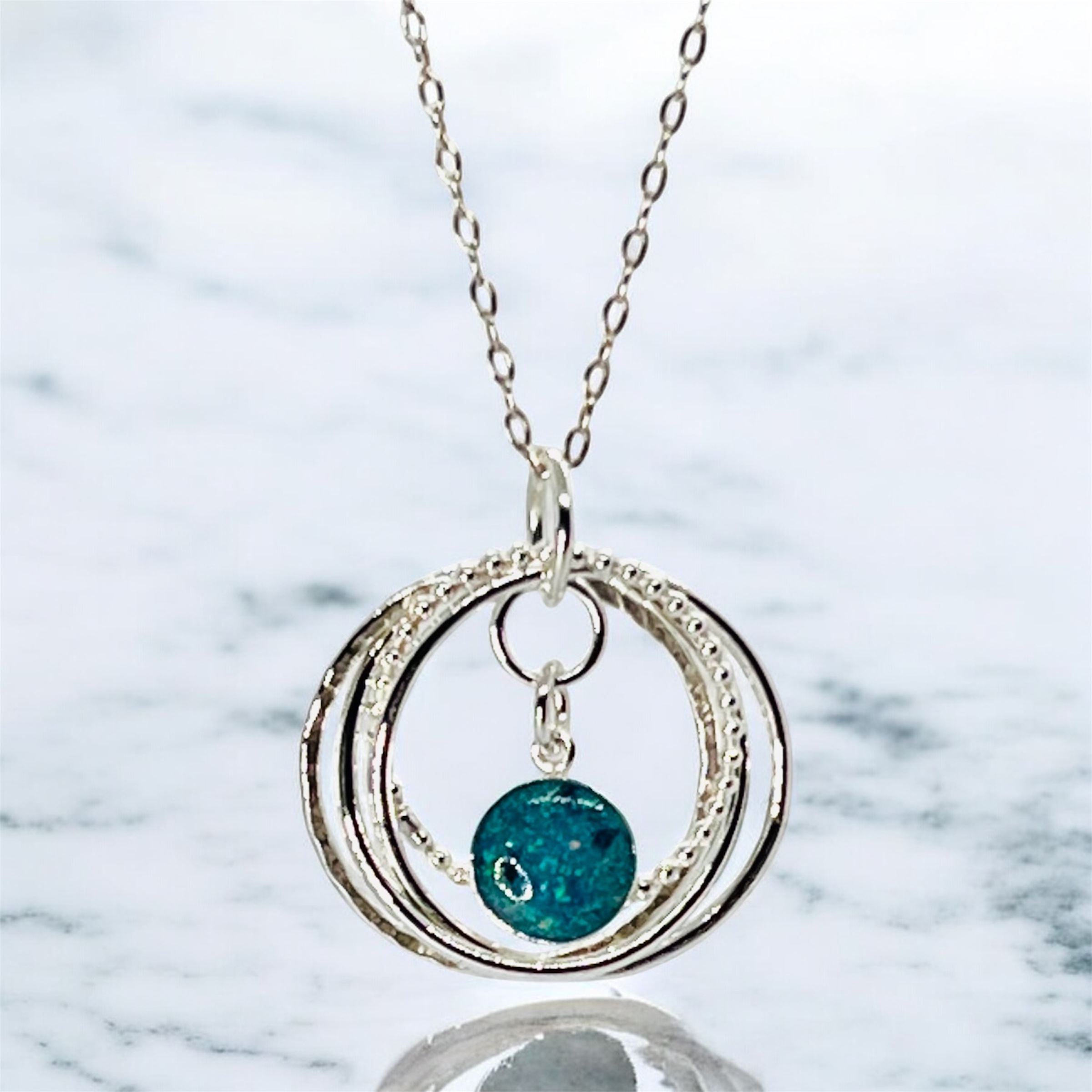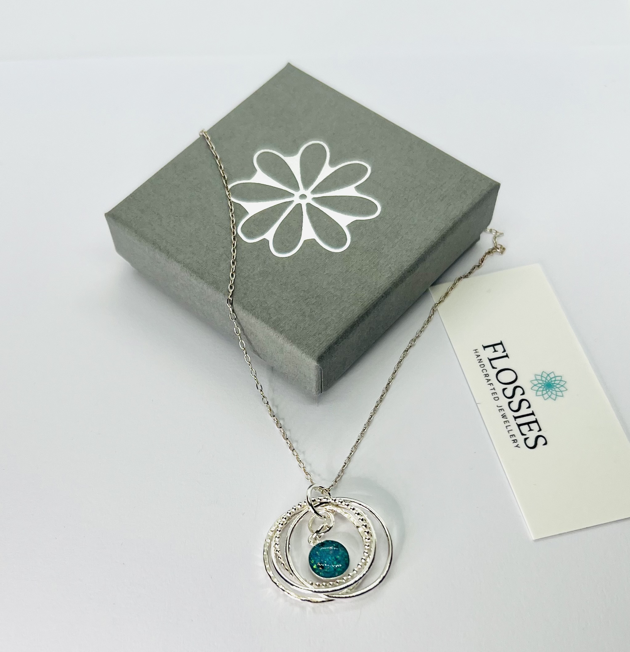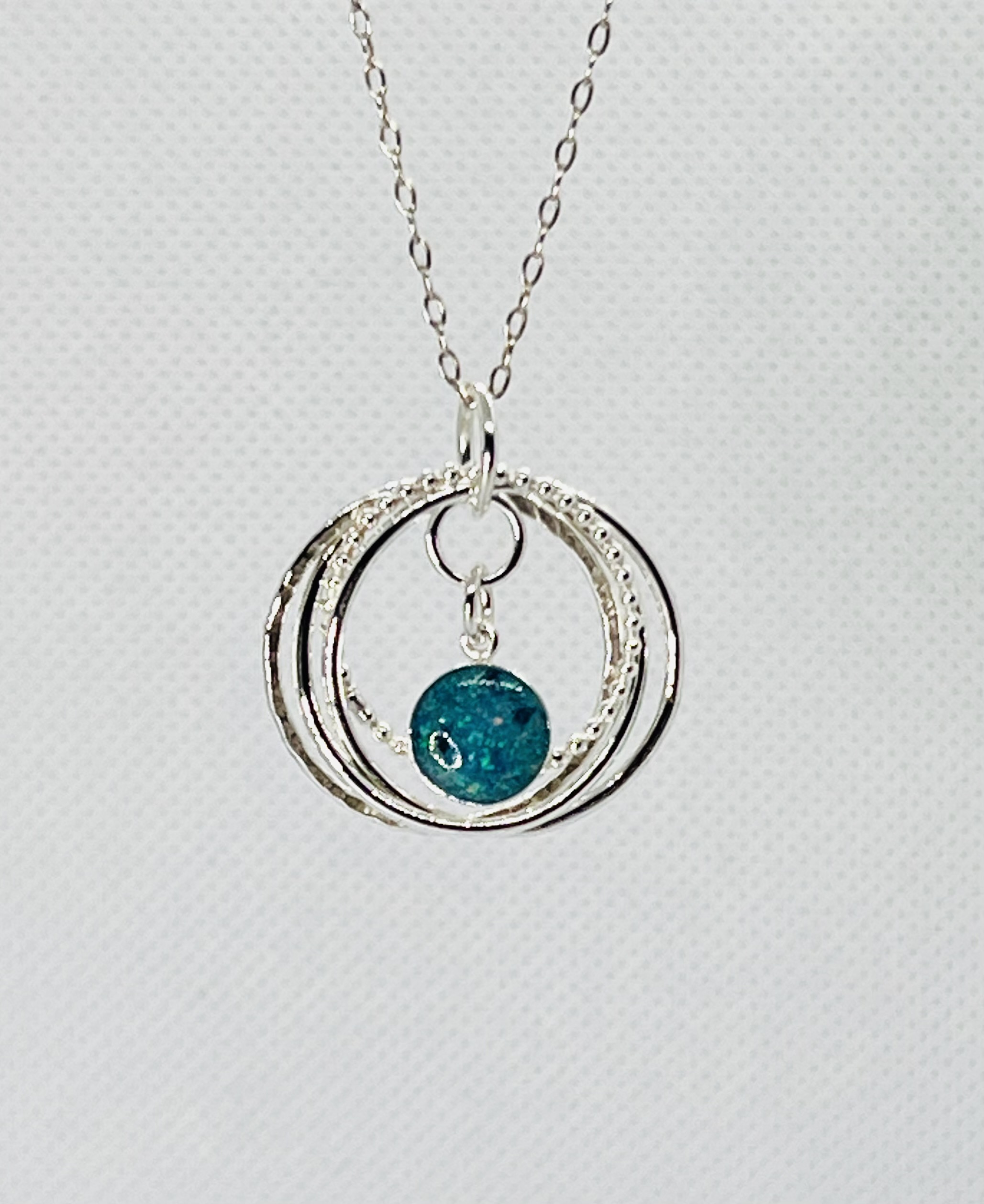 Blue crushed Opal charm and a selection of different textured hoops make this a truly unusual necklace, ideal for special occasion gifts. It can be made to order using the hoops to signify a special birthday – one hoop for each decade, please contact me for details
