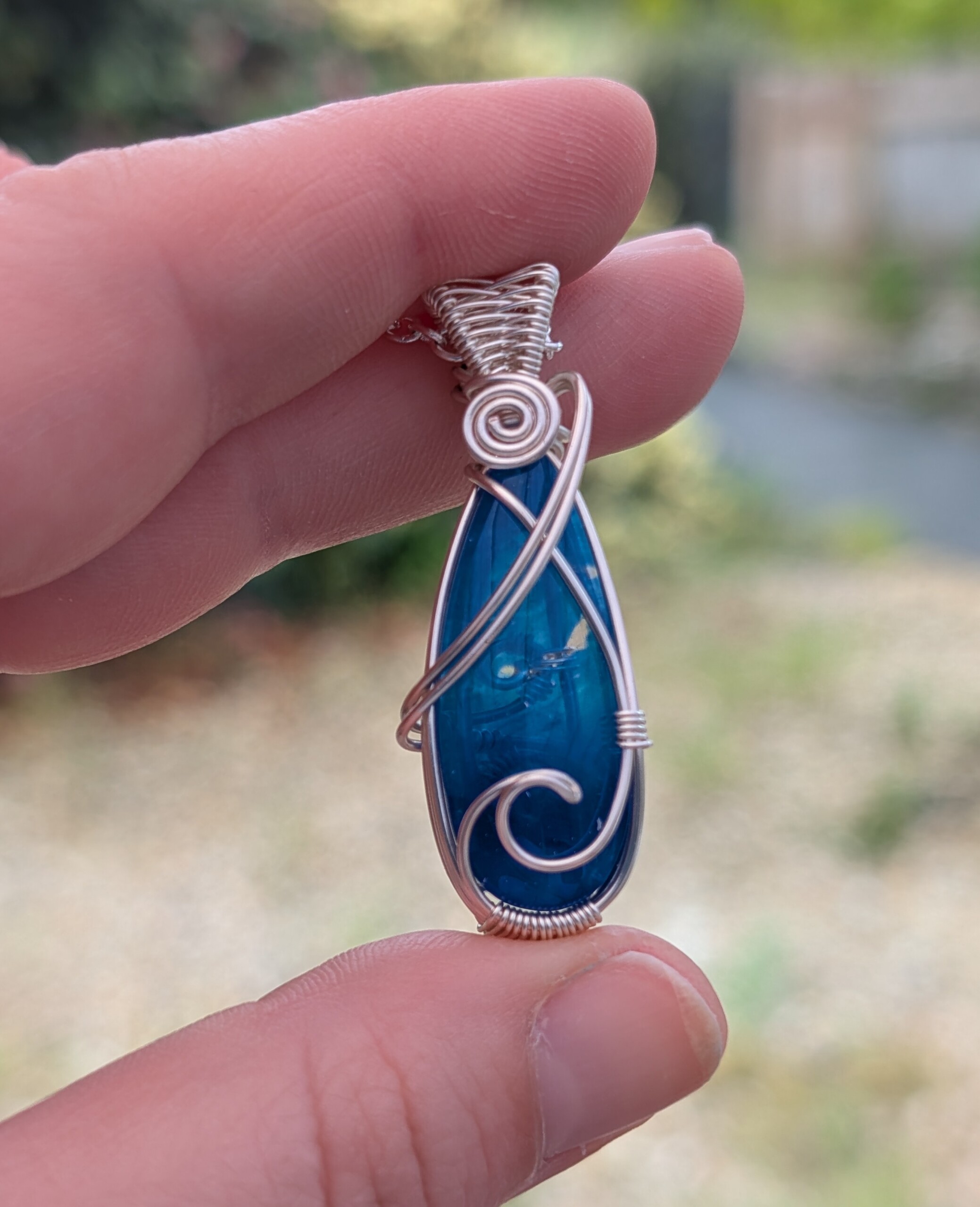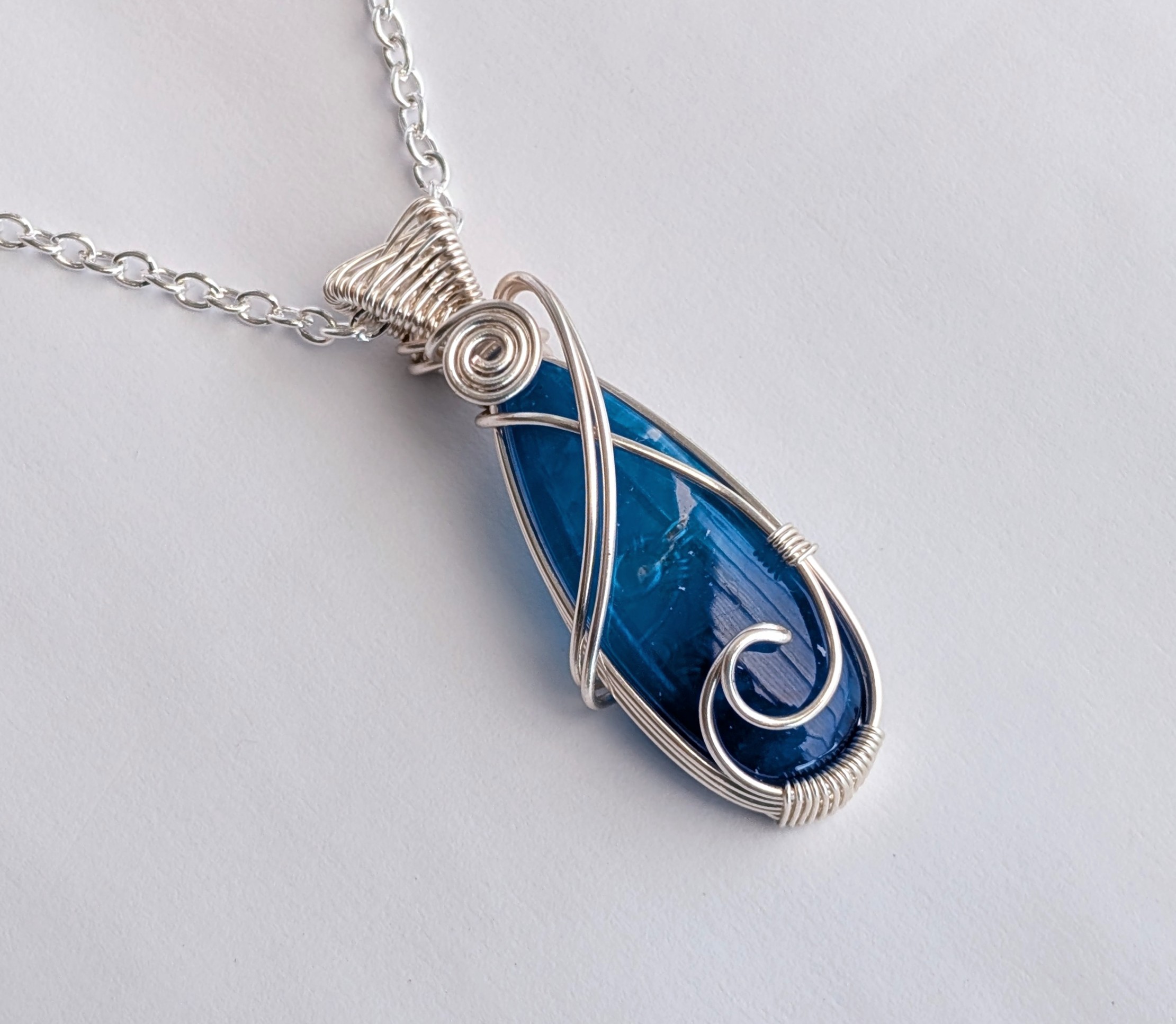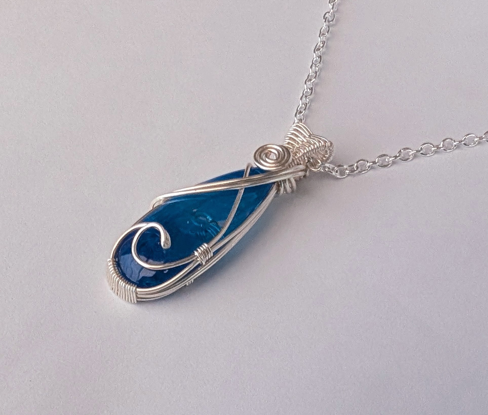 I’ve wrapped the surfite using silver plated copper wire, which has a tarnish resistant coating. I’ve also created a wave shape across the front of the pendant as a nod to its origin. It has quite a wide bail with a pretty ‘figure of eight’ weave across it.Â