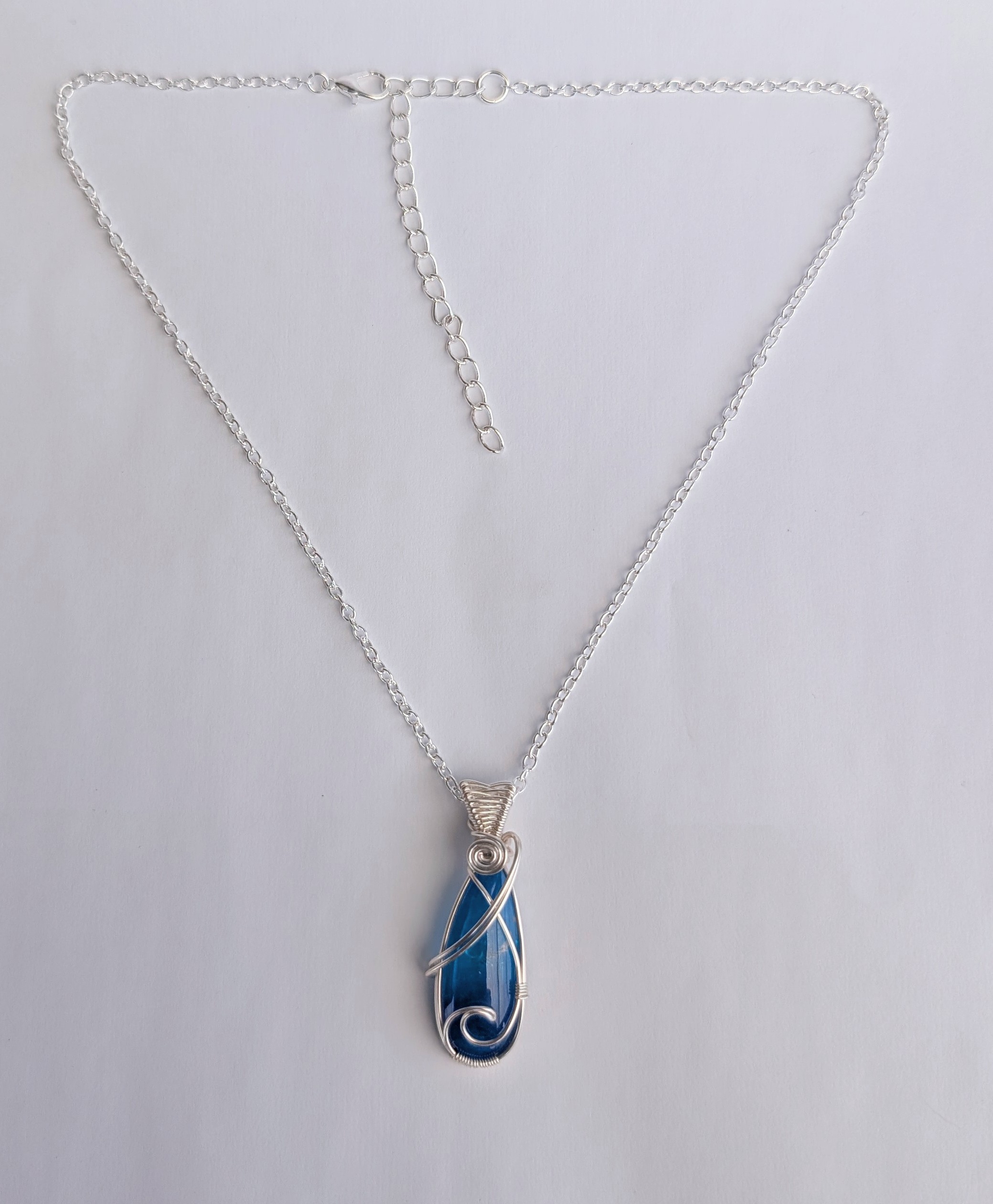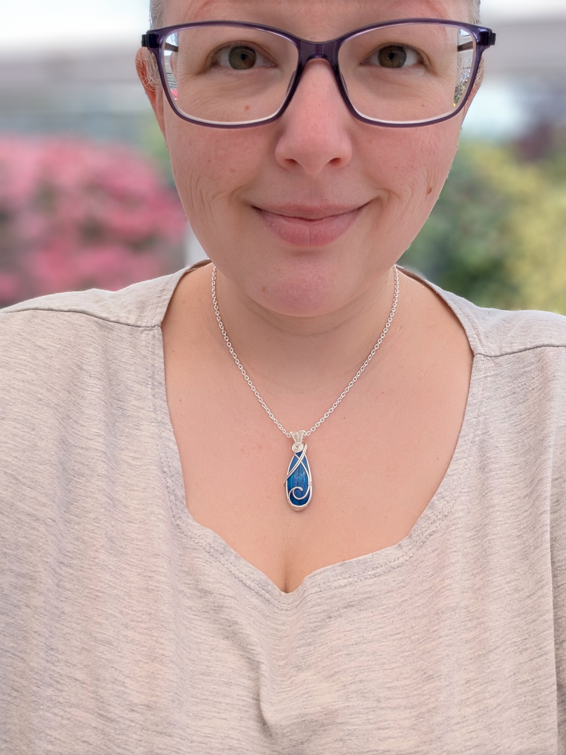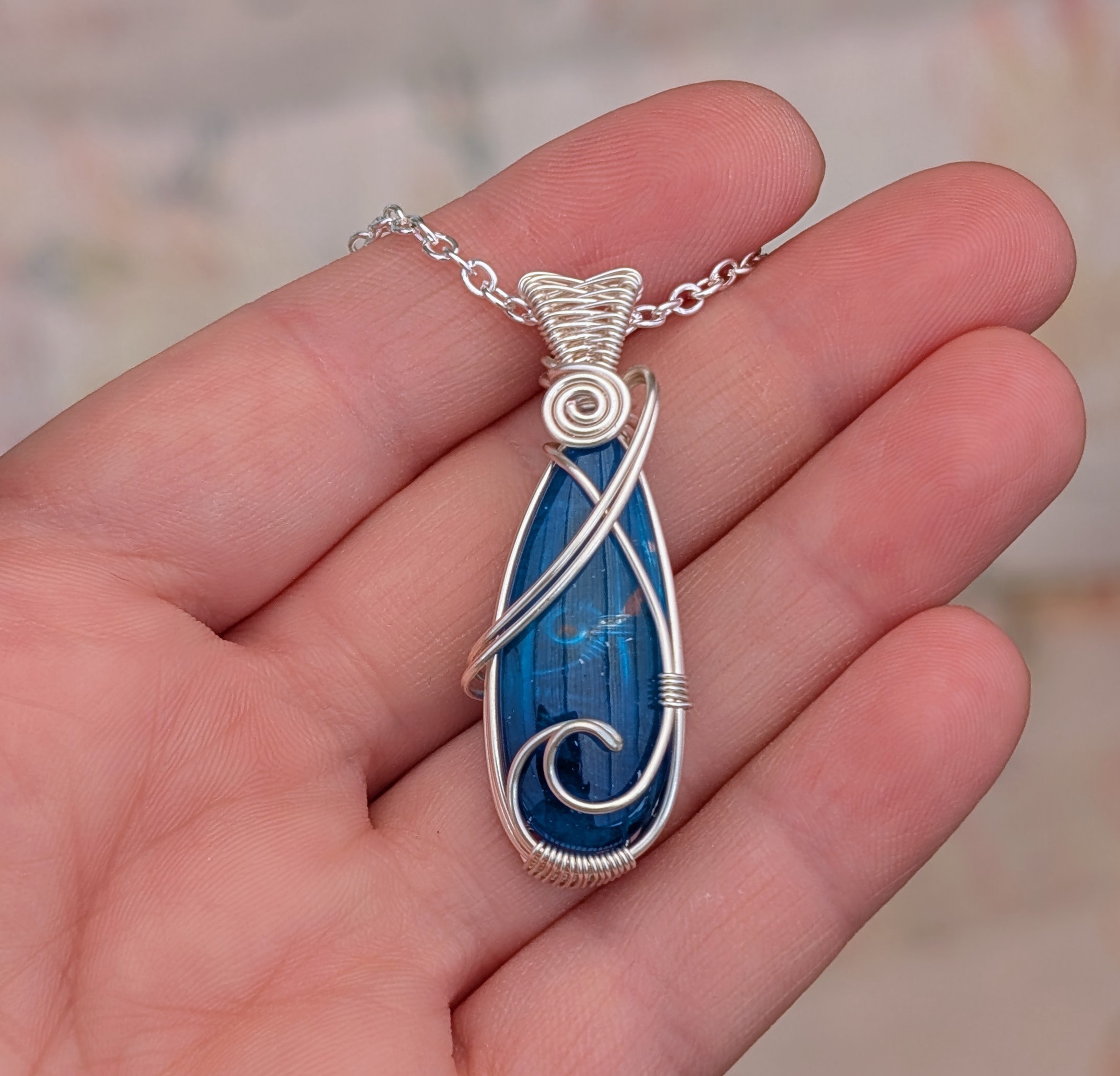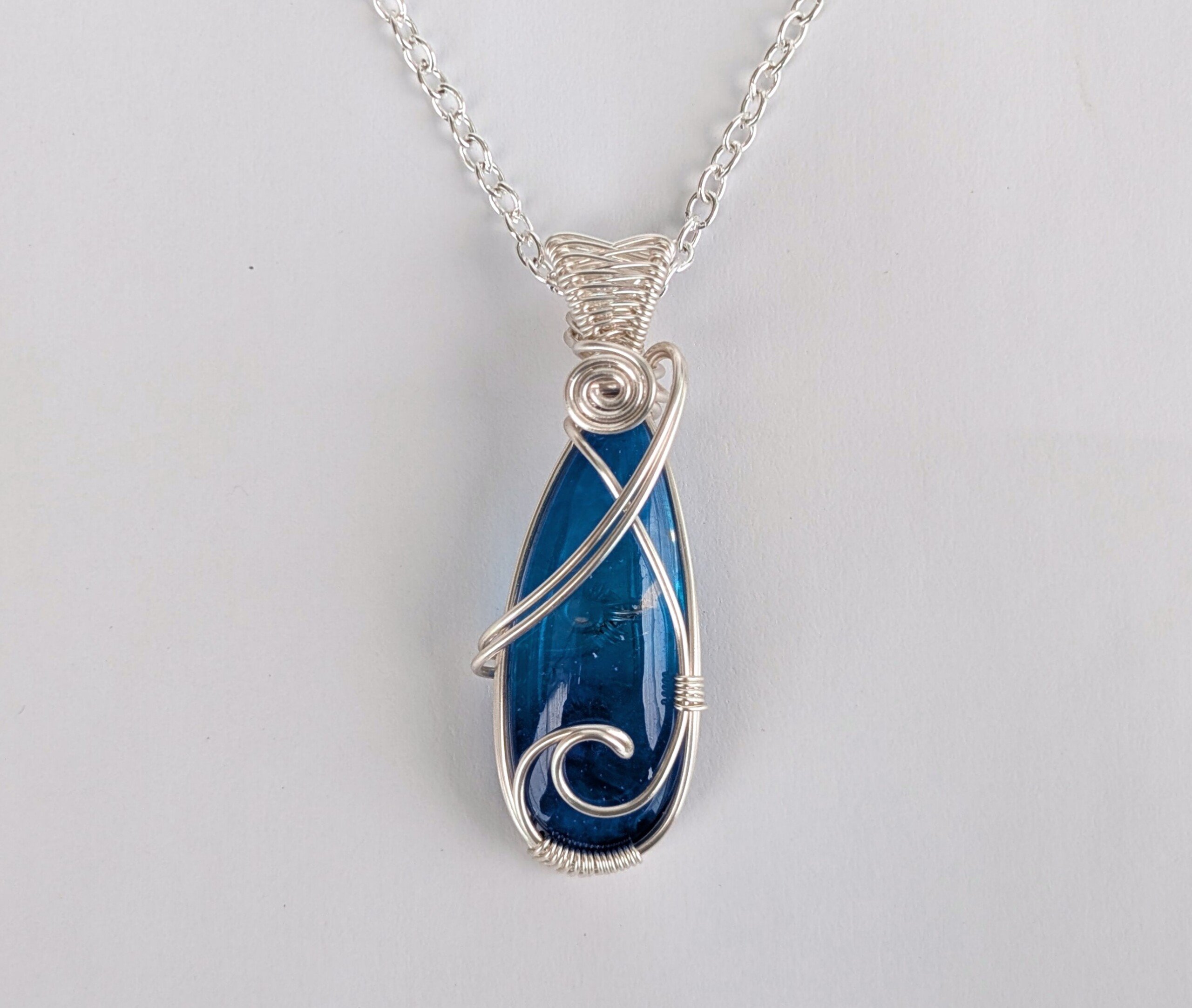 I’ve wrapped the surfite using silver plated copper wire, which has a tarnish resistant coating. I’ve also created a wave shape across the front of the pendant as a nod to its origin. It has quite a wide bail with a pretty ‘figure of eight’ weave across it.Â