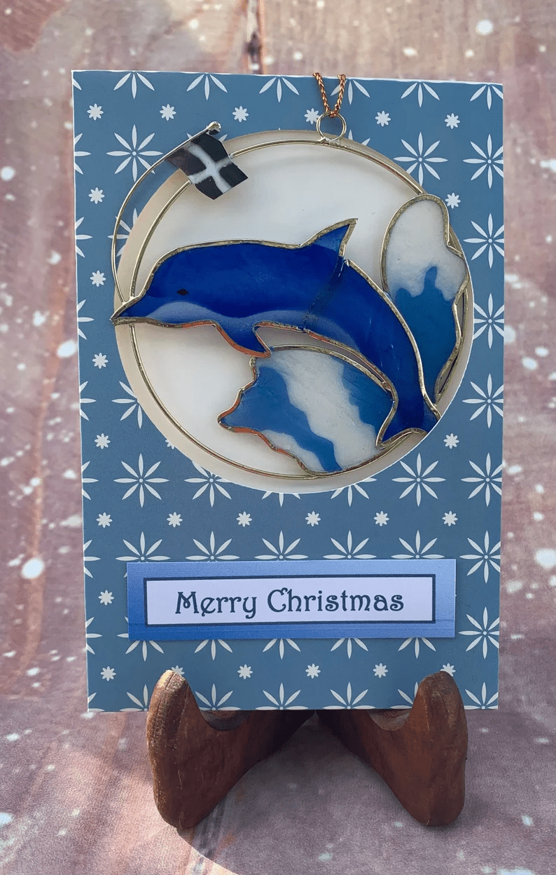 Christmas Ornament Card Dolphin in English.