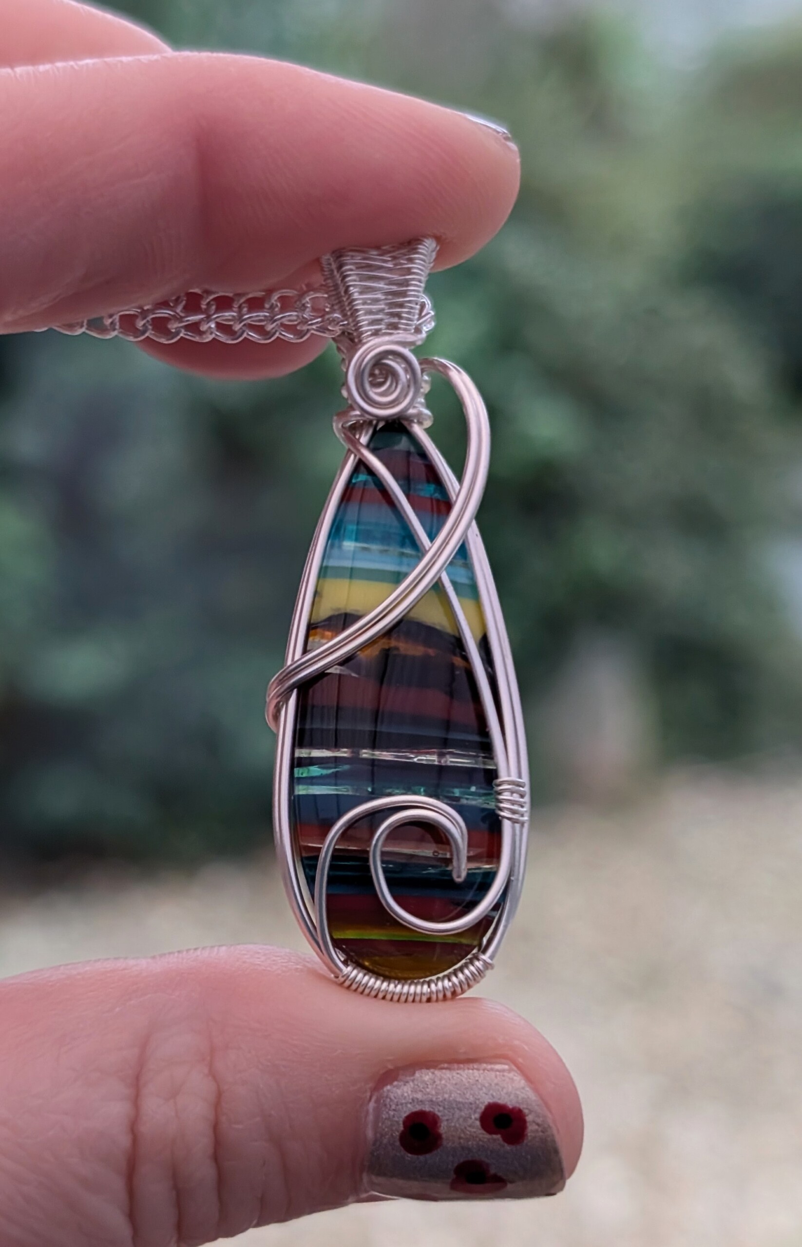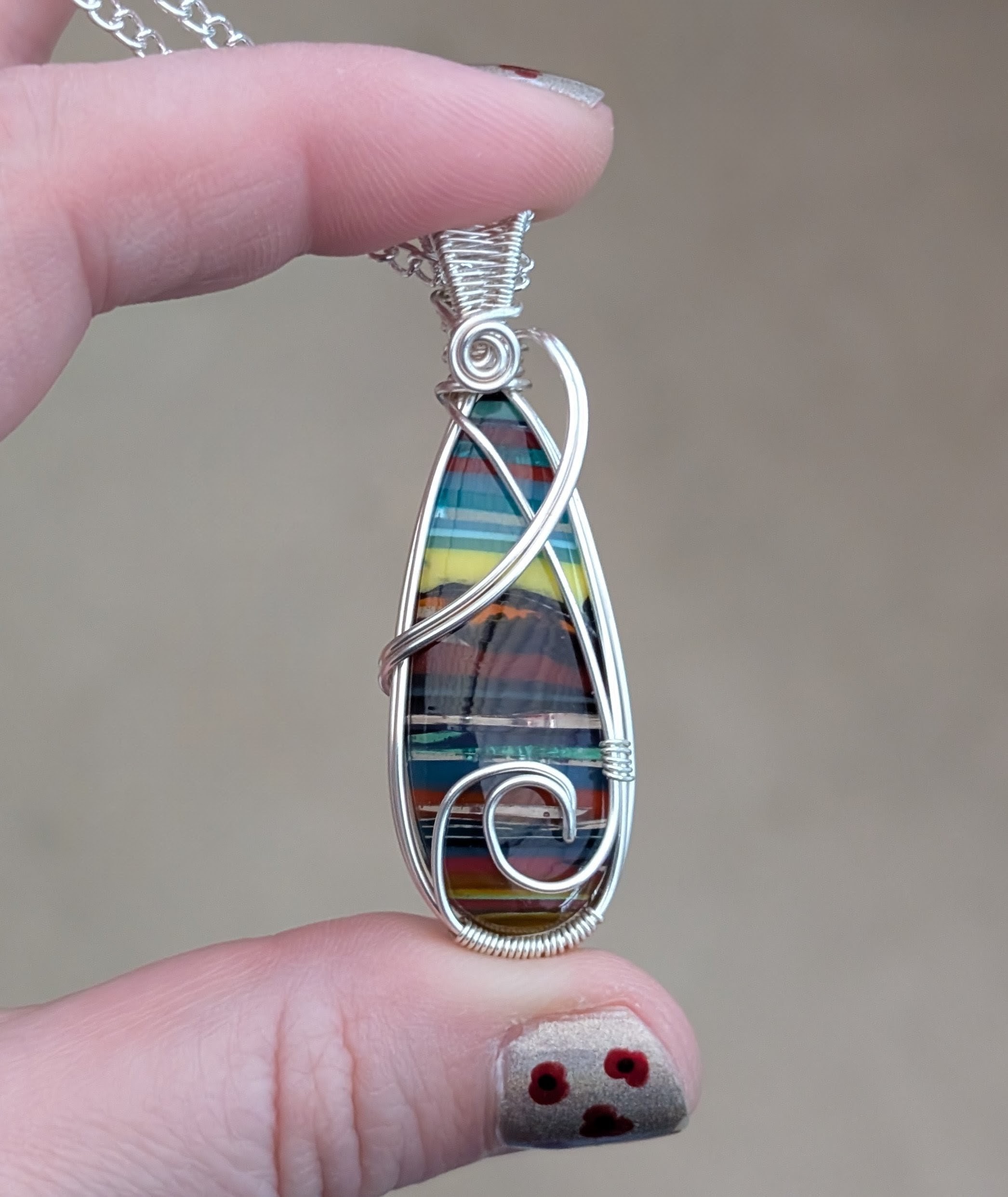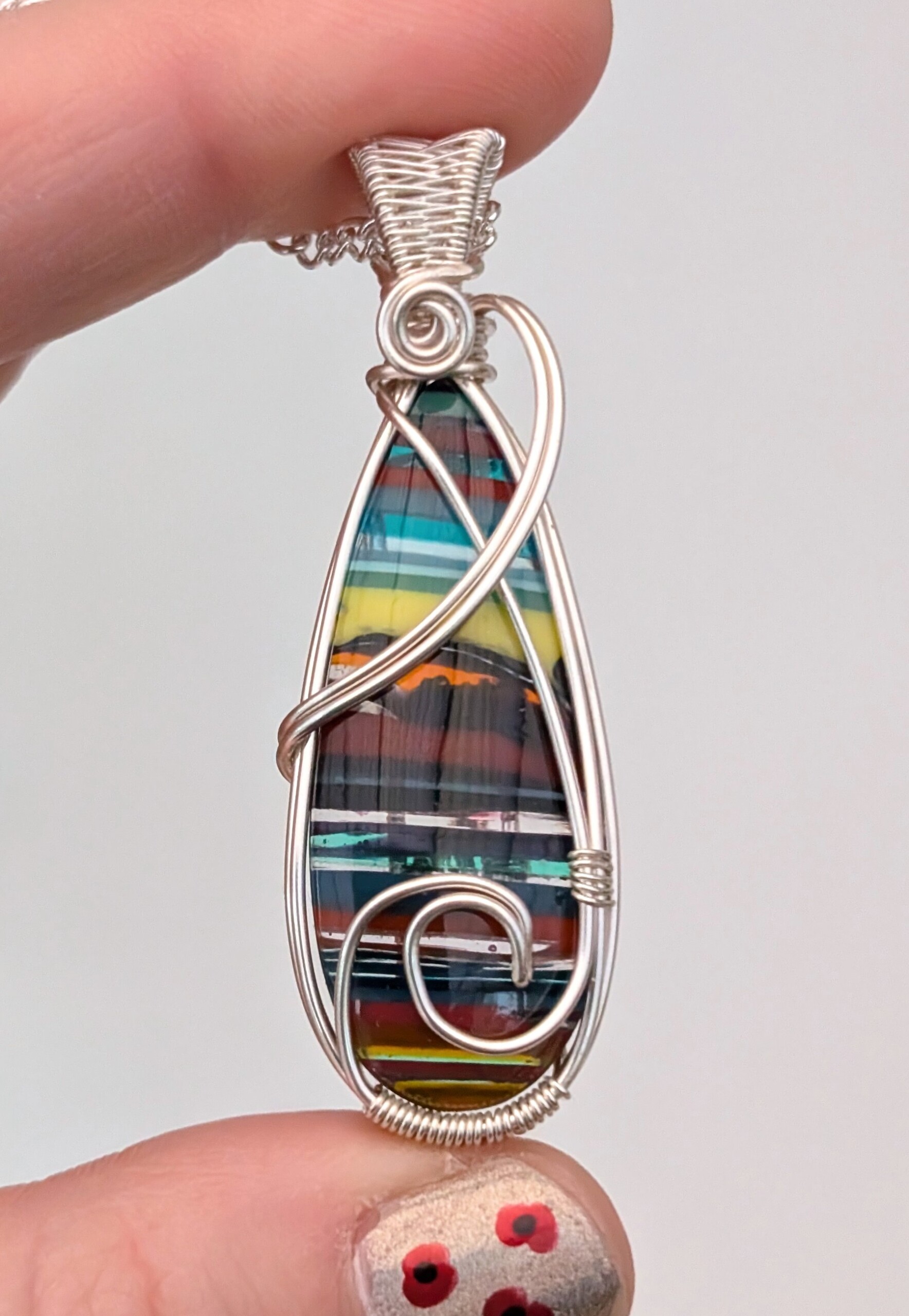 Colourful striped surfite pendant with silver plated copper wire.