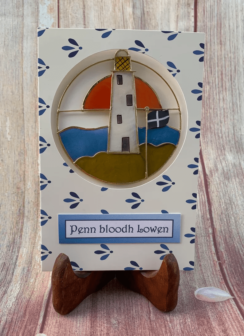 Cornish Birthday Card, Penn bloodh Lowen, Lighthouse Ornament Card