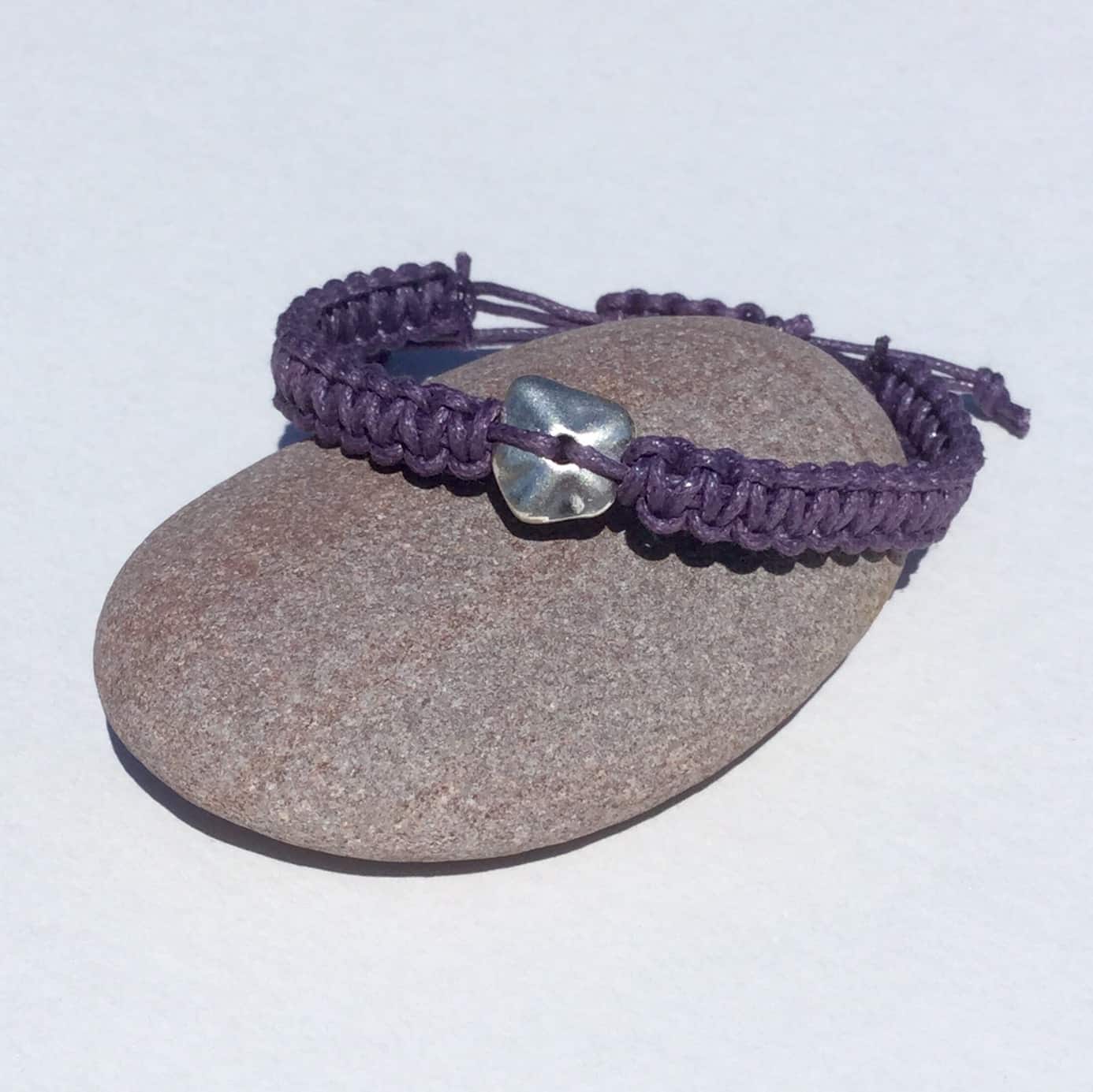 Purple cotton macrame friendship bracelet with a metal limpet bead