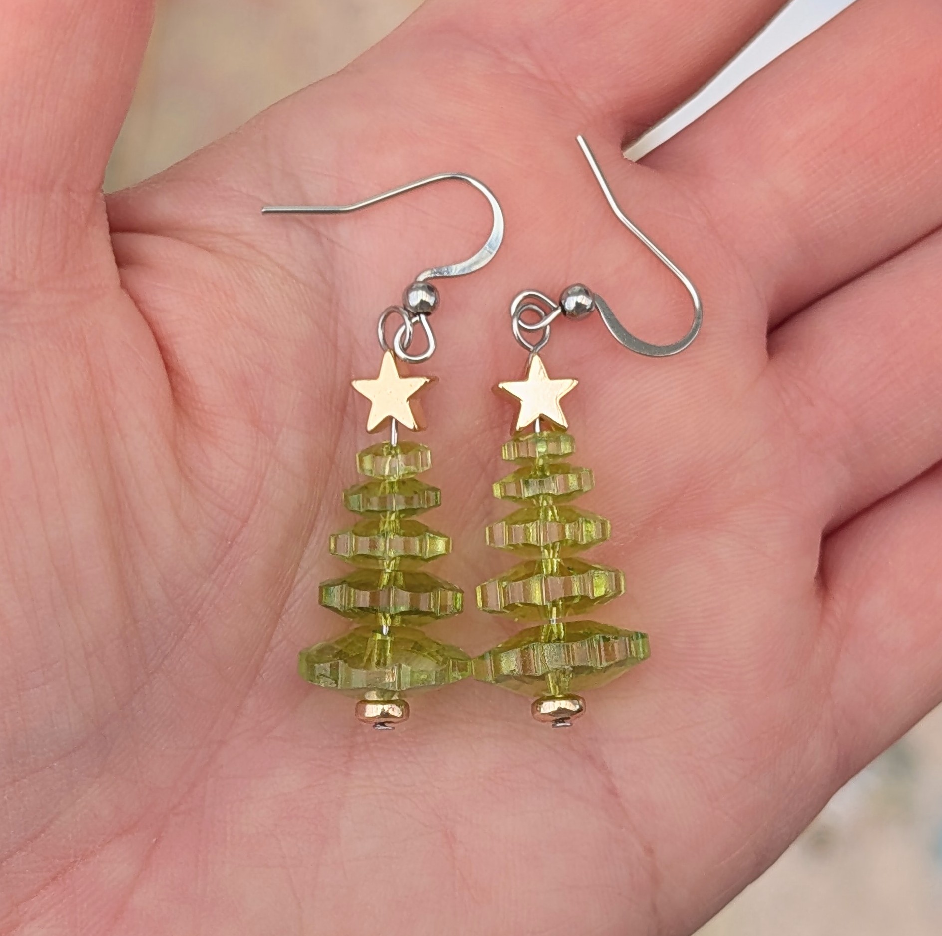 Lime Green Crystal Christmas tree earrings with gold hematite stars on stainless steel ear wires.