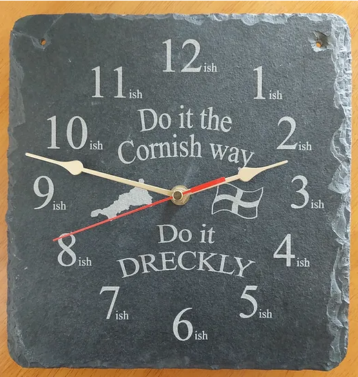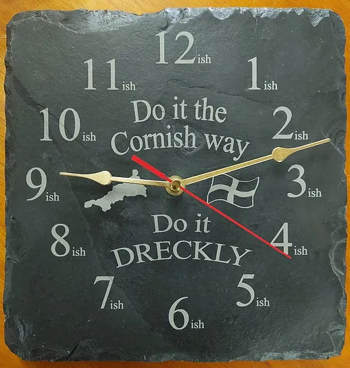 SKU: N/A Category: Home & Living Tags: Cornish clock, Cornish Gift, Cornwall clock, Dreckly Clock, Slate Clock
