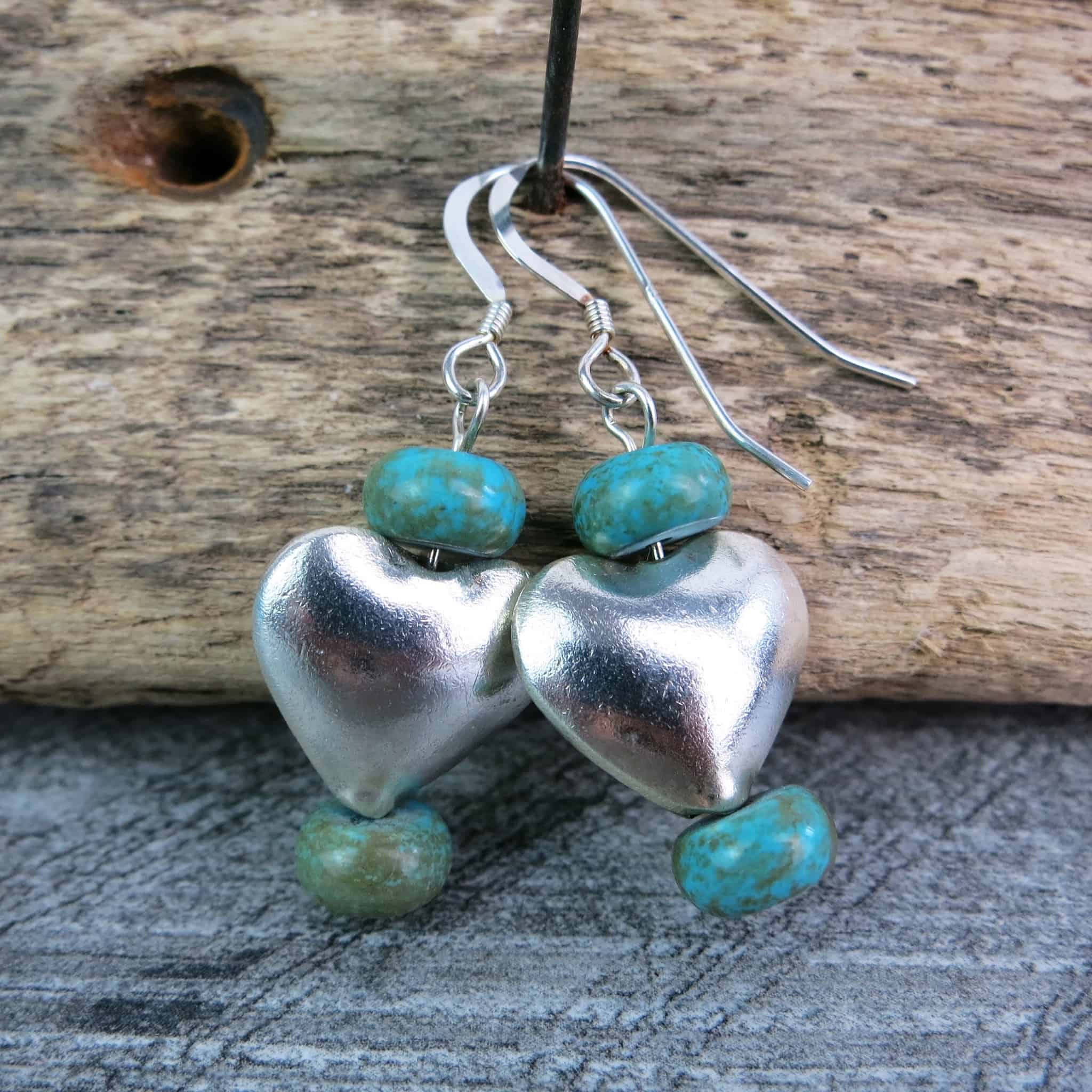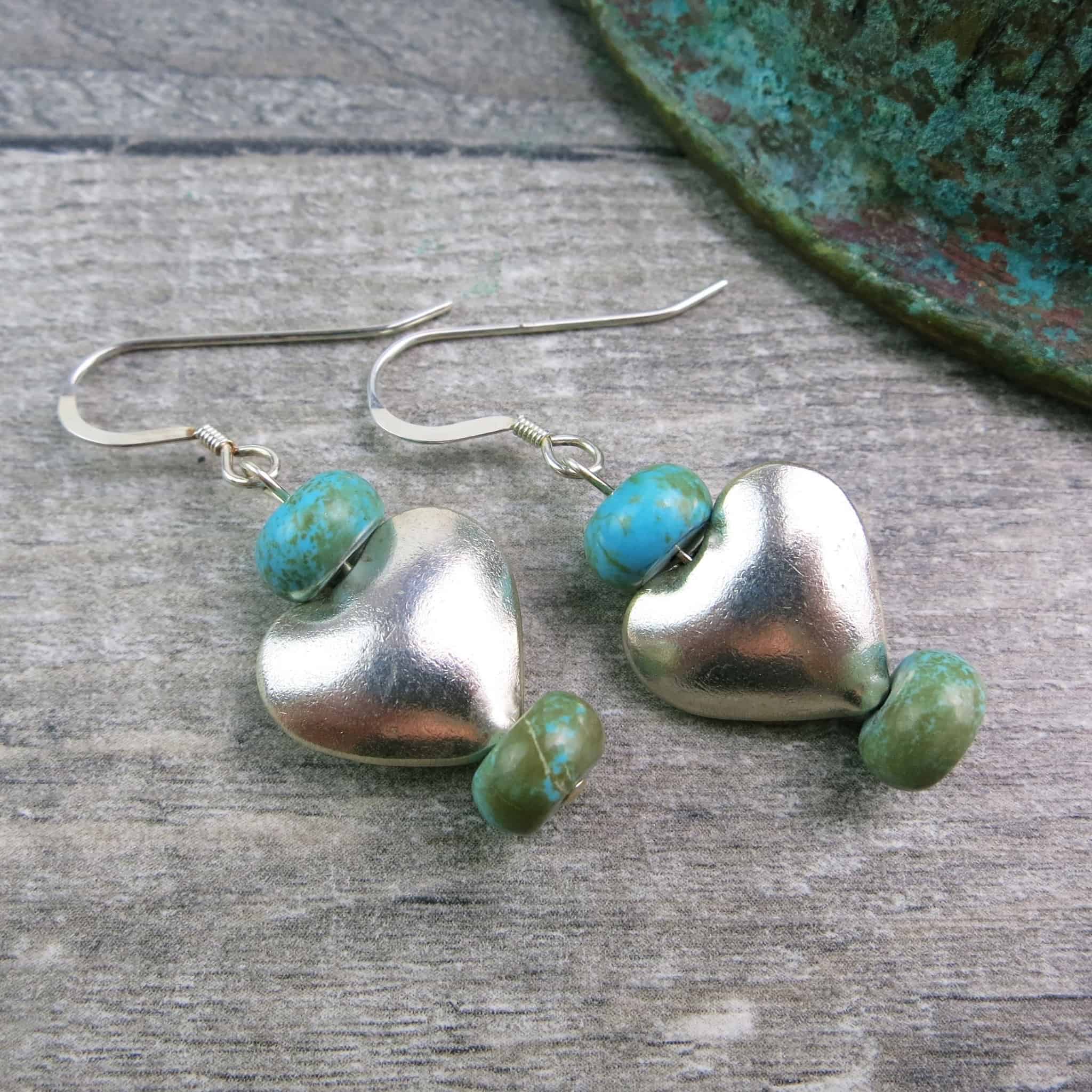 Gorgeous silver heart dangly earrings with turquoise beads and sterling silver stems.