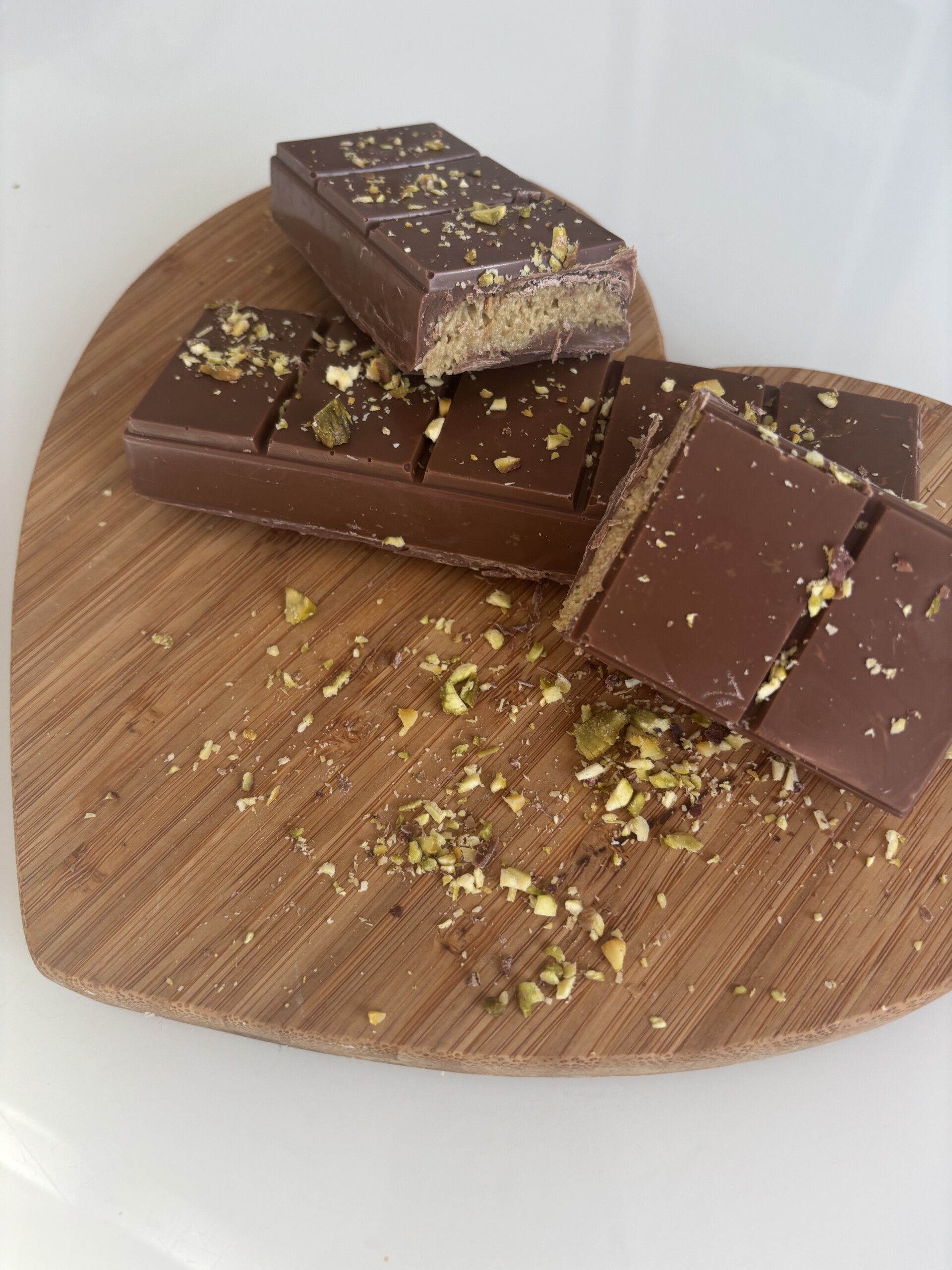 Dubai Chocolate Bar made with Belgium Milk Chocolate Contains Pistachio Nuts and Pistachio Cream, the bar weights 100g