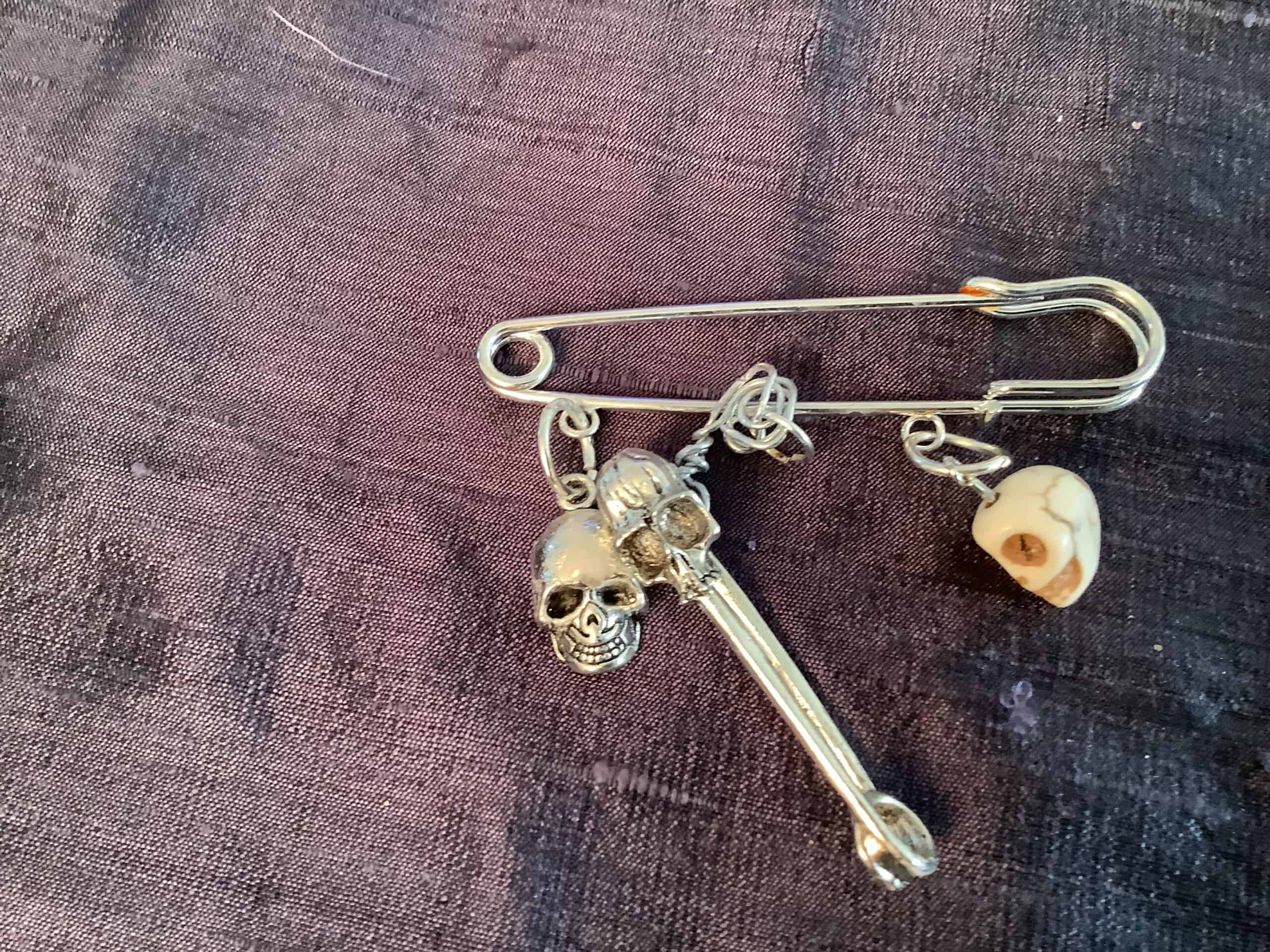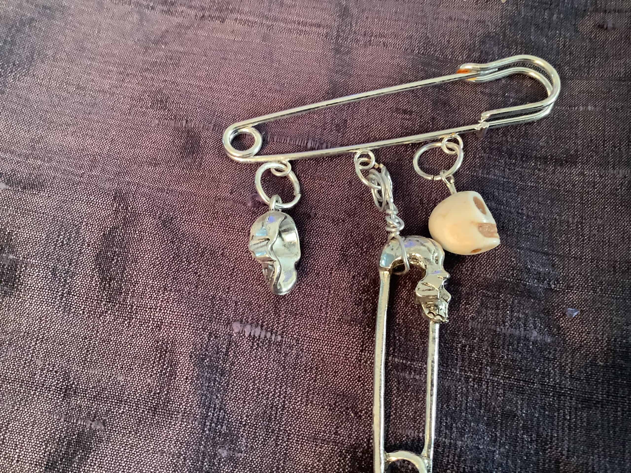 Silver coloured skull charm, bone coloured charm, skull safety pin charm unique