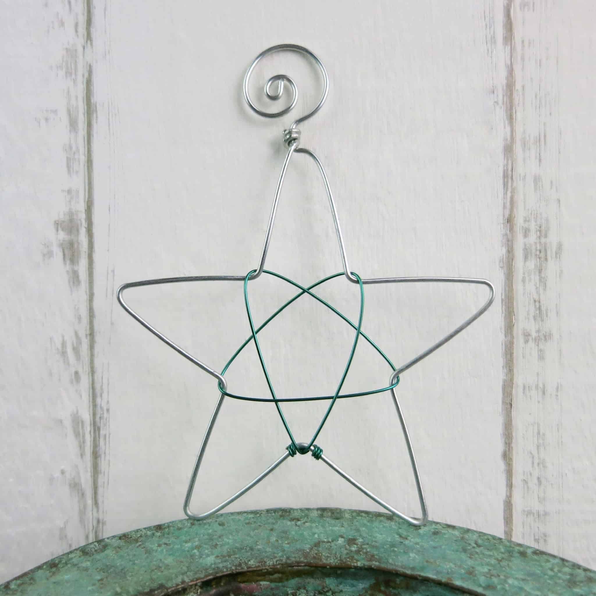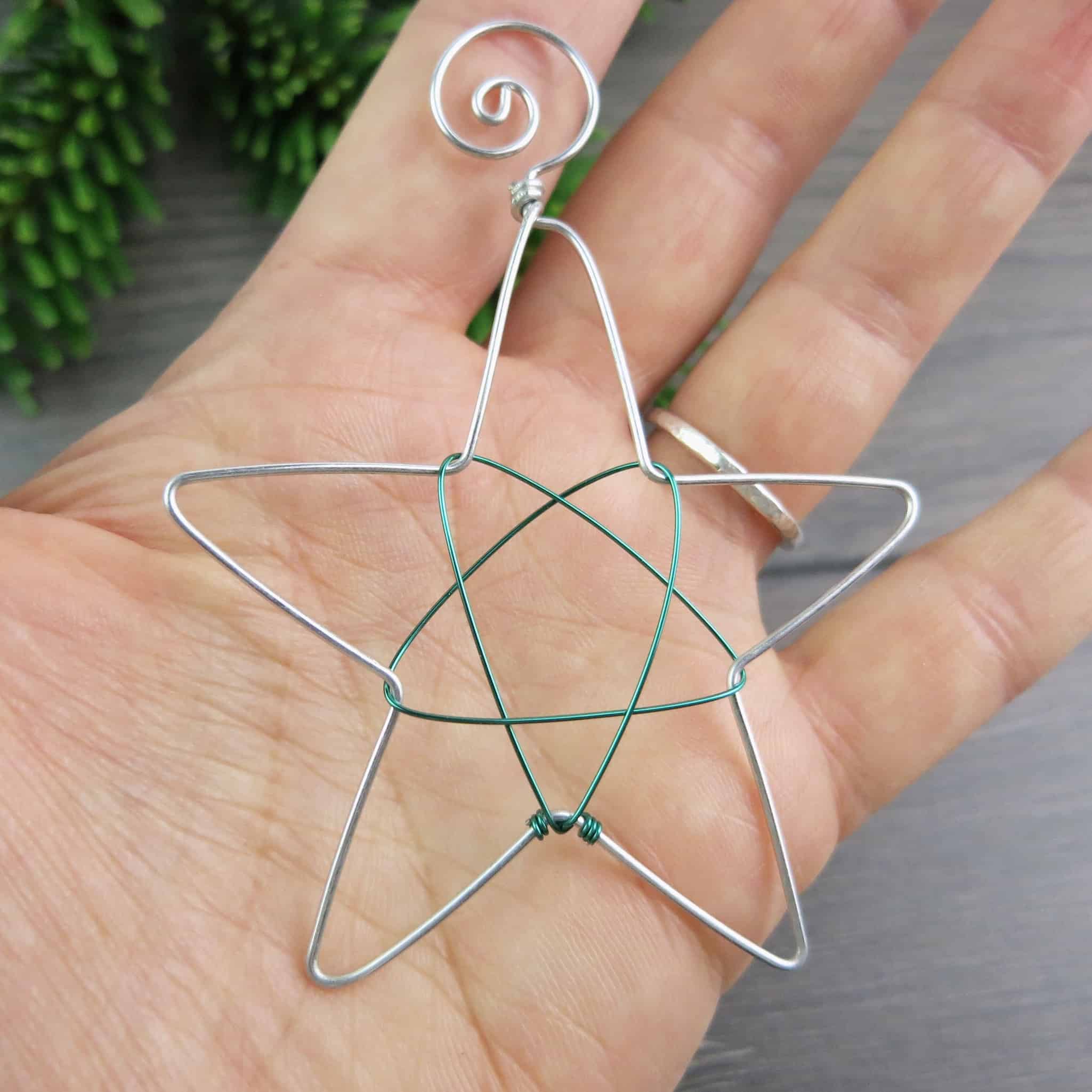 Silver wire star decoration with a green wire star centre held in my hand to show size.