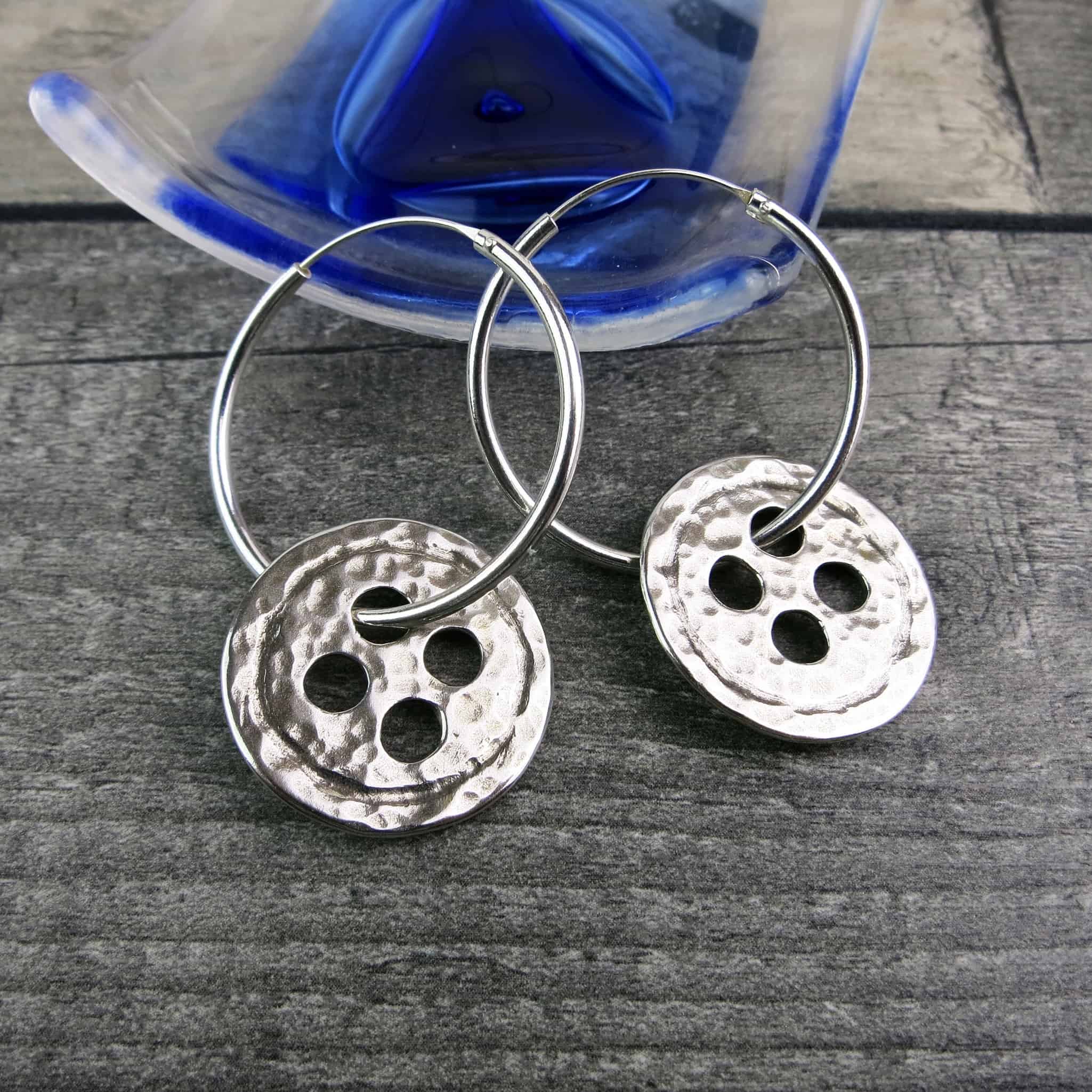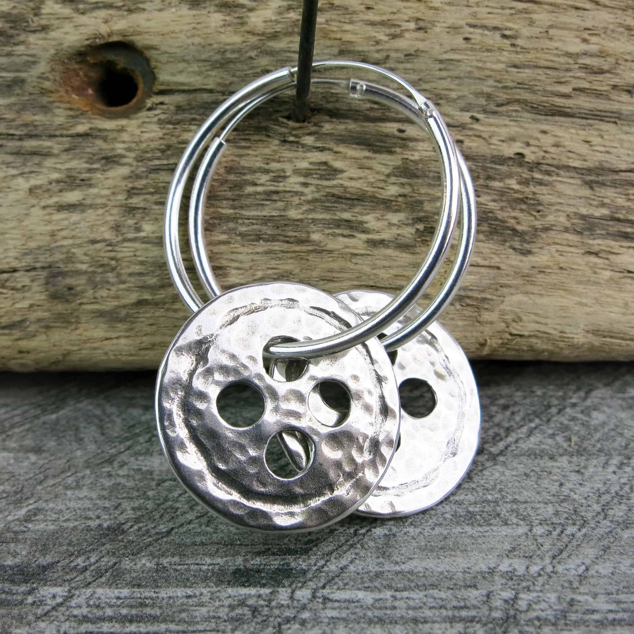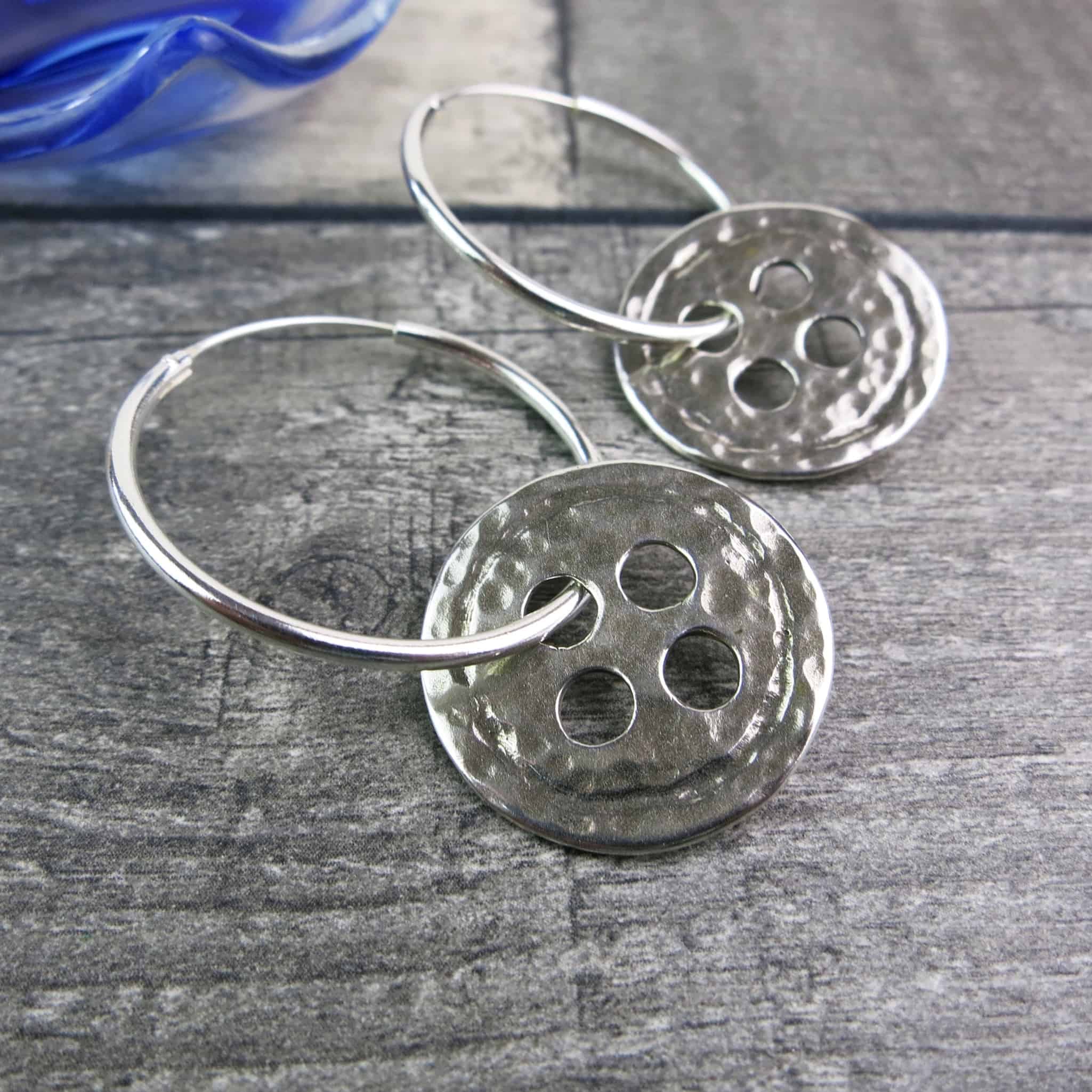 Larger hammered silver buttons on 30mm sterling silver hoop earrings.