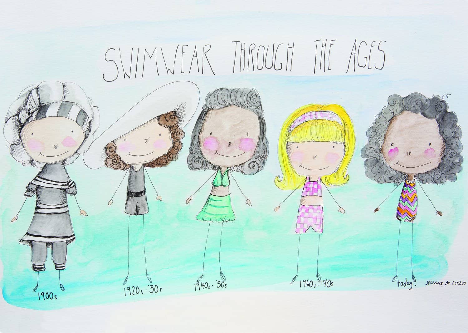 An A4 open water / wild swimming poster, briefly detailing the history of ladies swimming costumes over the last century. Ideal as a gift or as part of a gift.