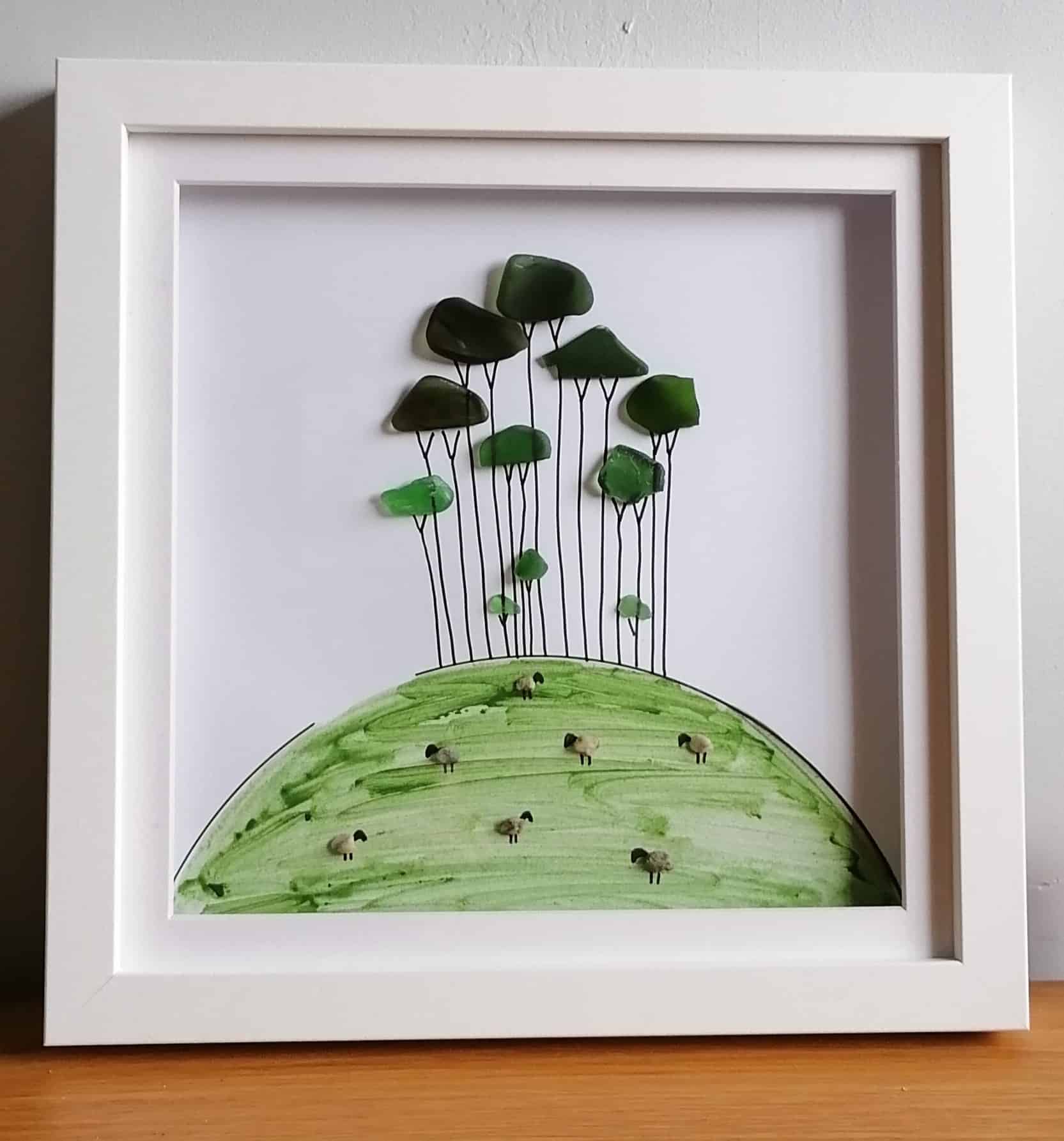 Loved by many, when you glimpse the trees, you know you’re… nearly there. This framed Cornish art uses assorted green hues of sea glass collected from Cornish beaches.  An acrylic painted hill, with your own mini flock of sheep, has the wording ‘nearly there’.