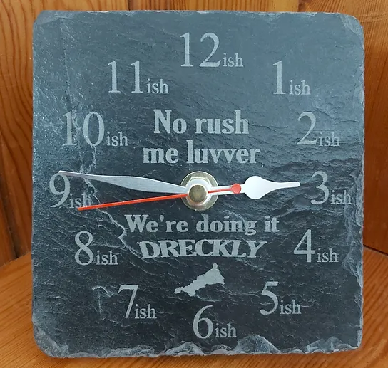SKU: N/A Category: Home & Living Tags: Cornish clock, Cornish Gift, Cornwall clock, Dreckly Clock, Slate Clock