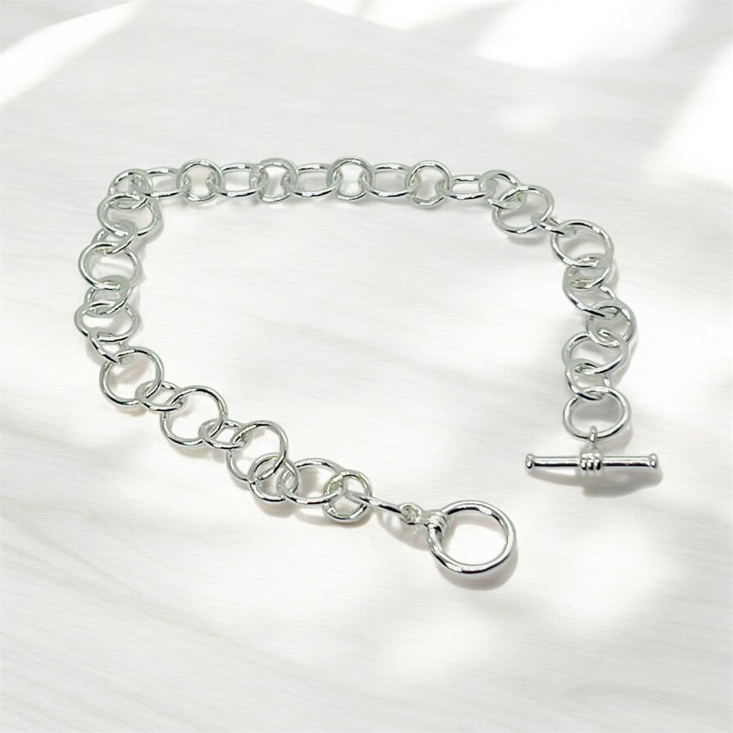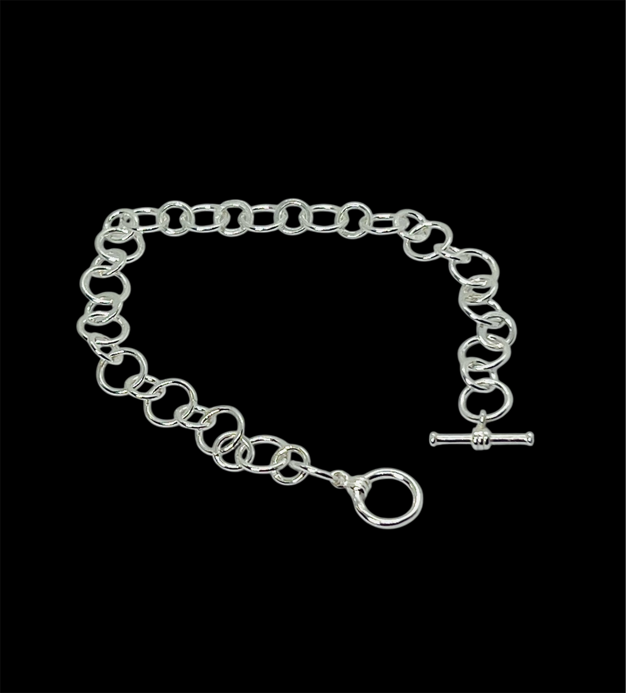 Sterling Silver Circle Link Bracelet, finished with a sleek round toggle clasp. Handcrafted in my St Agnes workshop, this modern, circle design measures approximately 18cm and offers a perfect balance of style and simplicity.