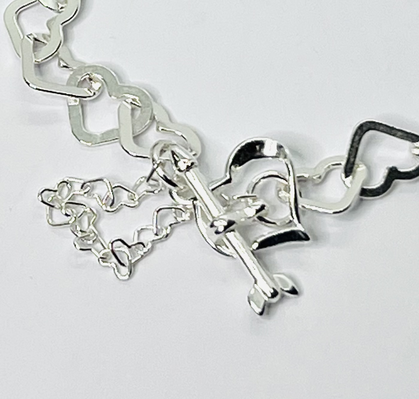 Crafted with care in my St Agnes, Cornwall workshop, this exquisite bracelet made from high-quality sterling silver, it features delicate, heart-shaped links, symbolising connection and affection. The design is completed with a charming heart-shaped toggle clasp, adding both elegance and a tiny heart security chain. A timeless piece, perfect as a meaningful gift or a treasured addition to your own jewellery collection.  Approximately 18cm long