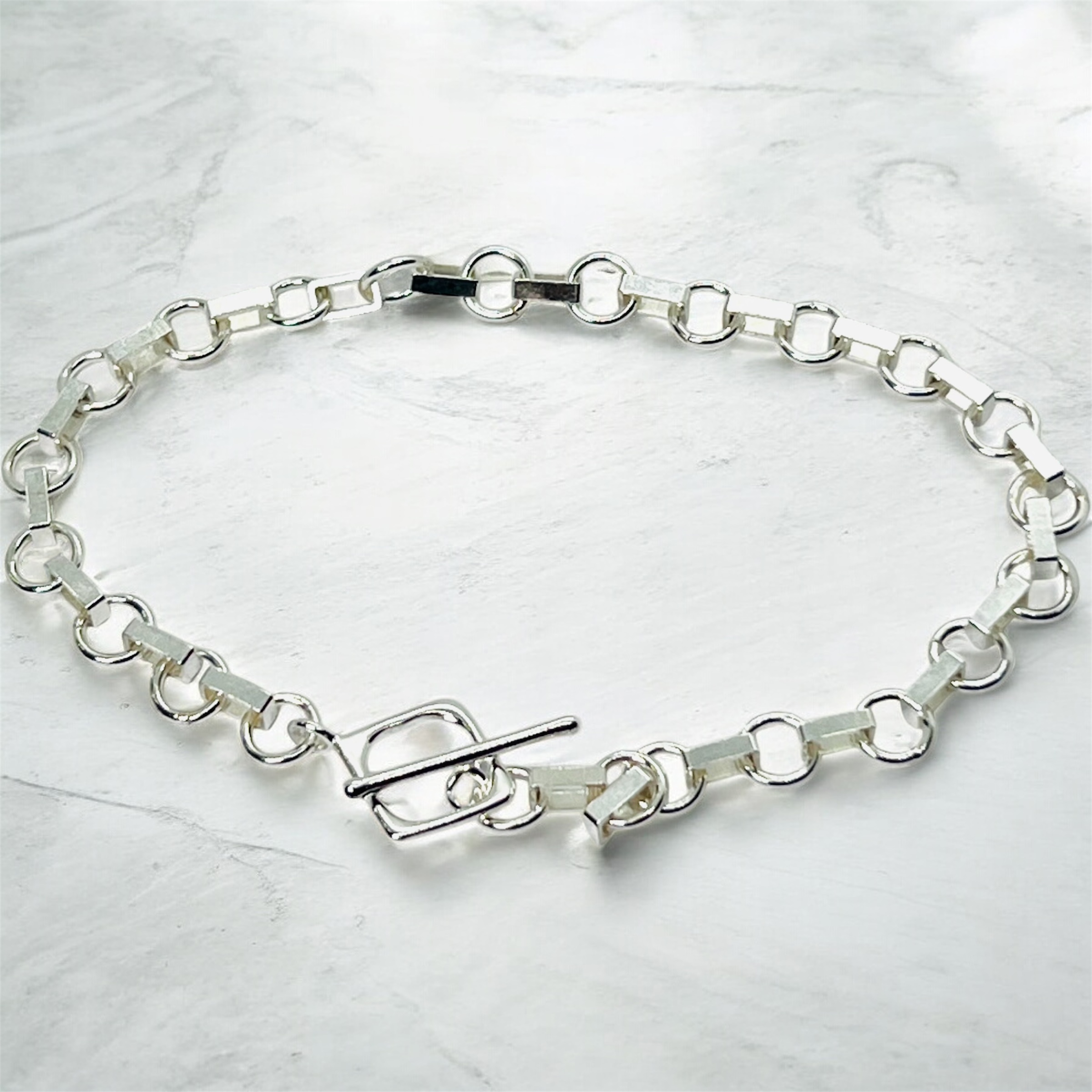Sterling Silver Rectangle and Circle Link Bracelet, finished with a sleek square toggle clasp. Handcrafted in my St Agnes workshop, this modern, geometric design measures approximately 18cm and offers a perfect balance of style and simplicity.