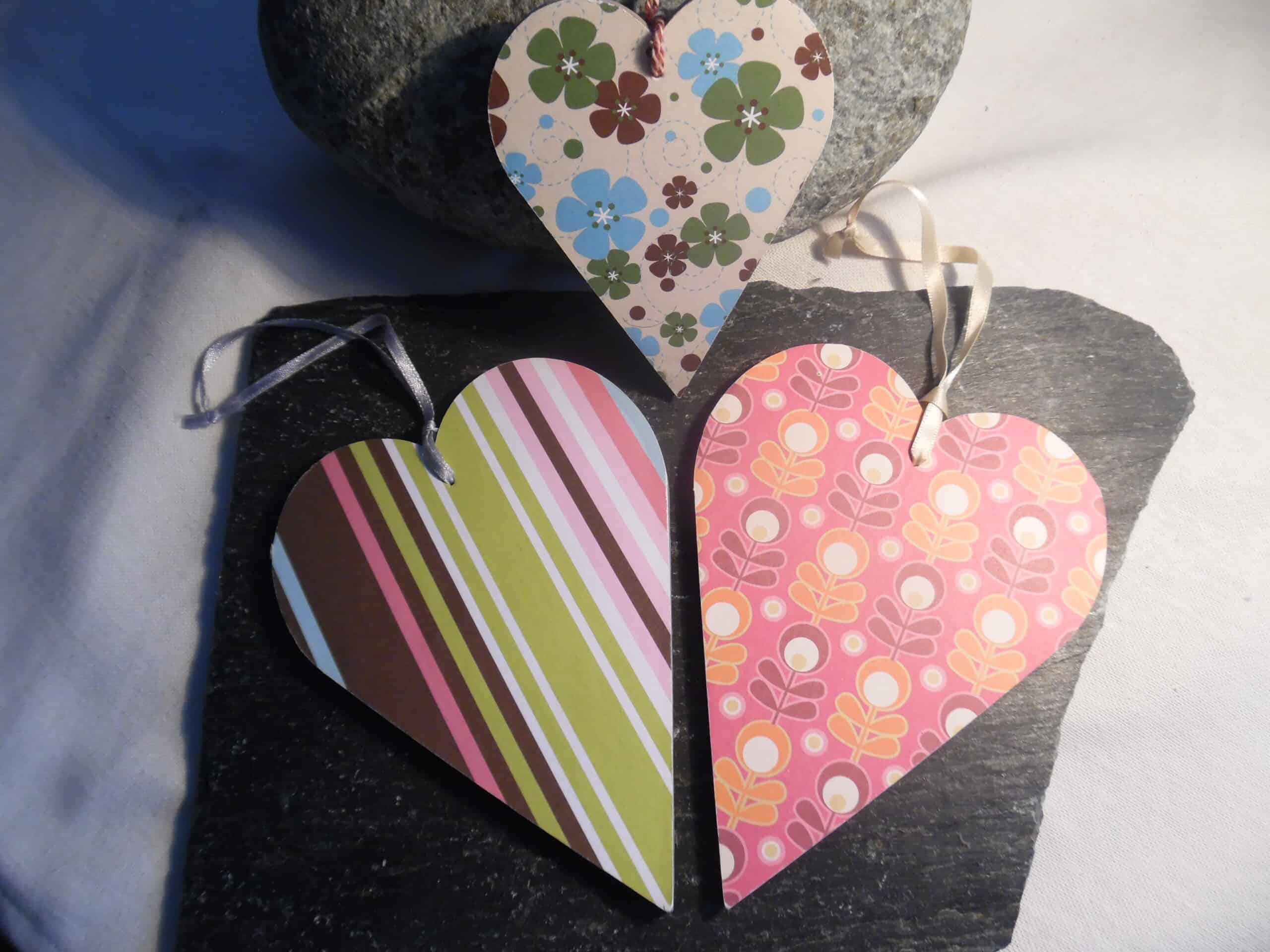 Pack of three wooden paper decorated HeartsĀ  painted plain to back