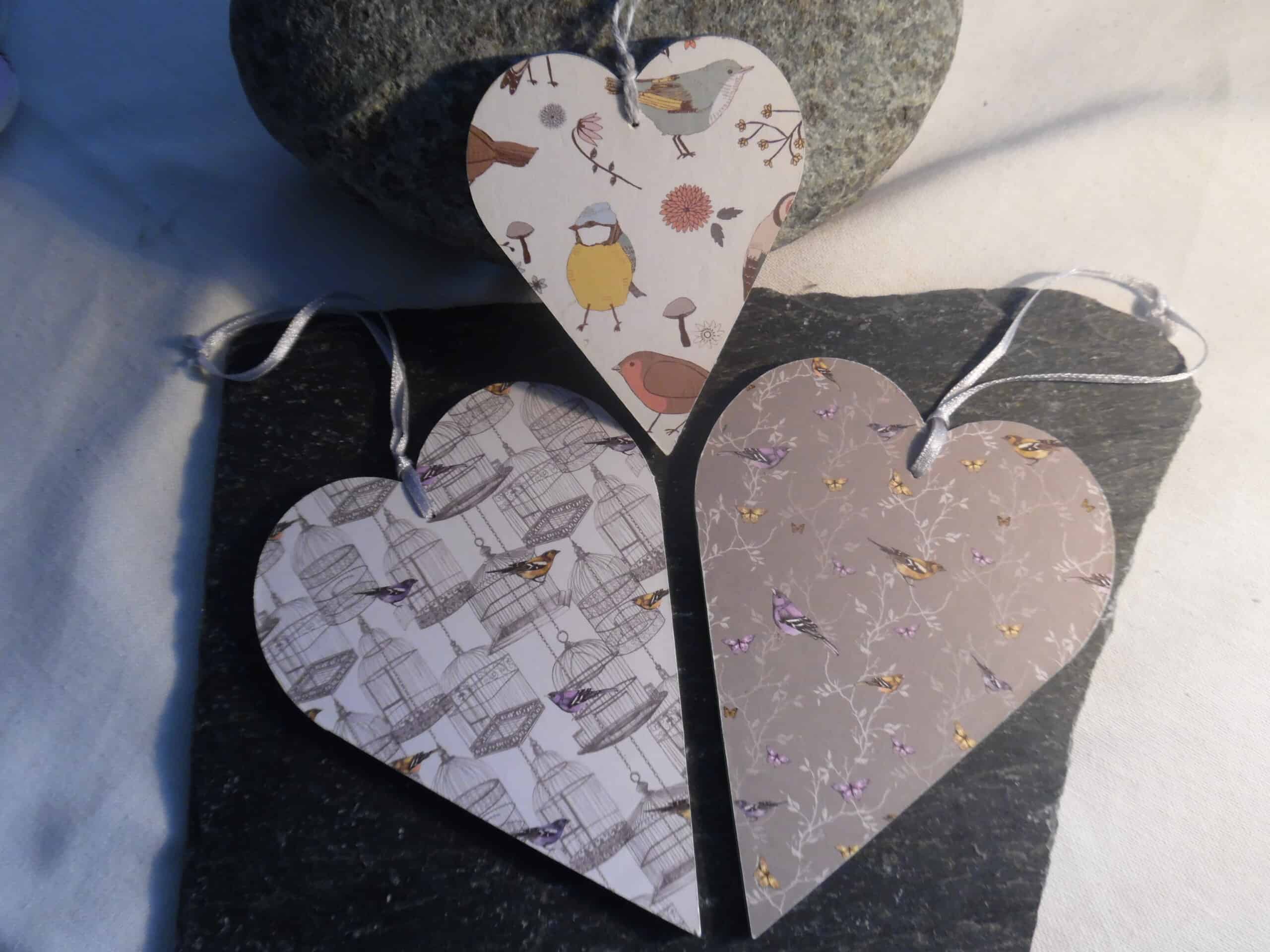 Pack of three wooden paper decorated Hearts featuring Bird designs and painted on back